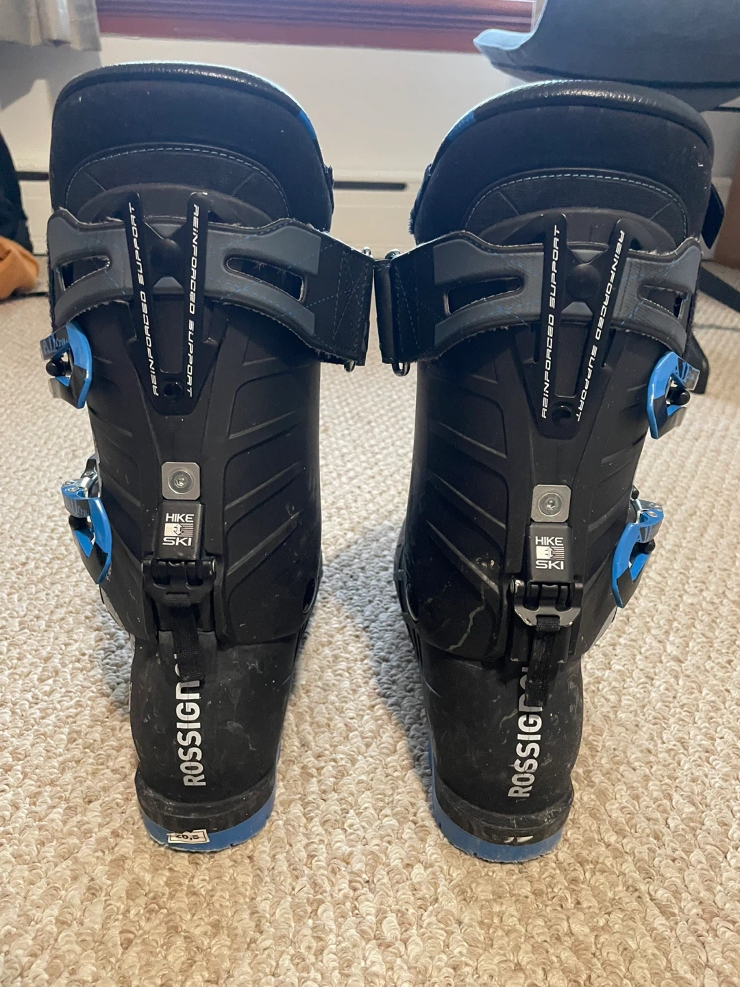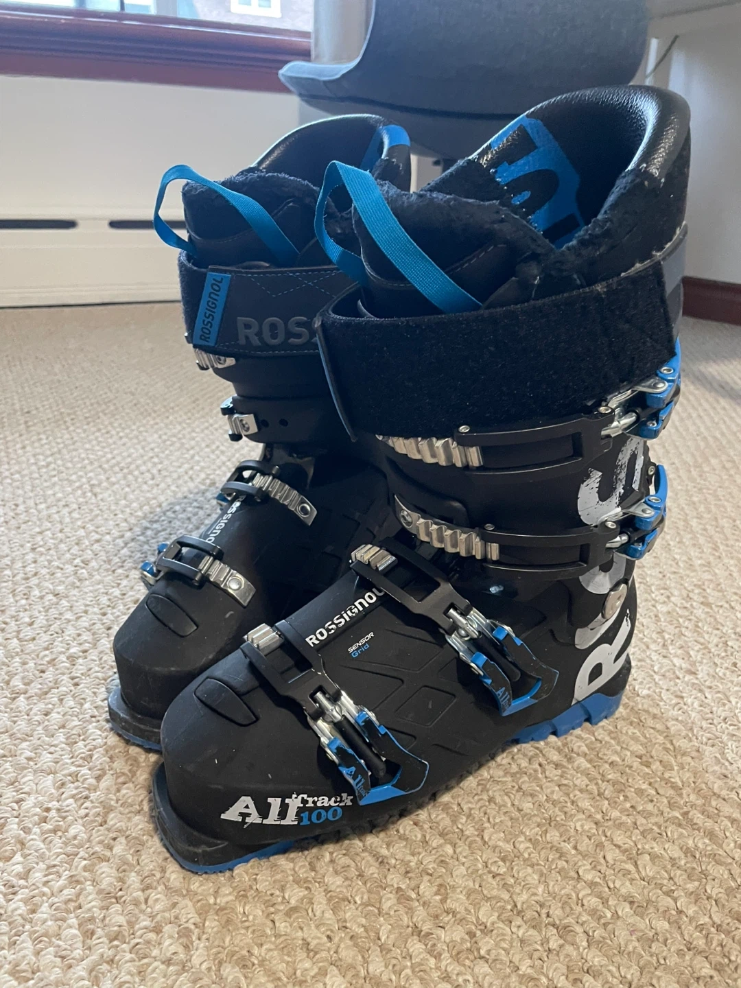 These are Rossignol Alltrack 100 ski boots in black and blue.