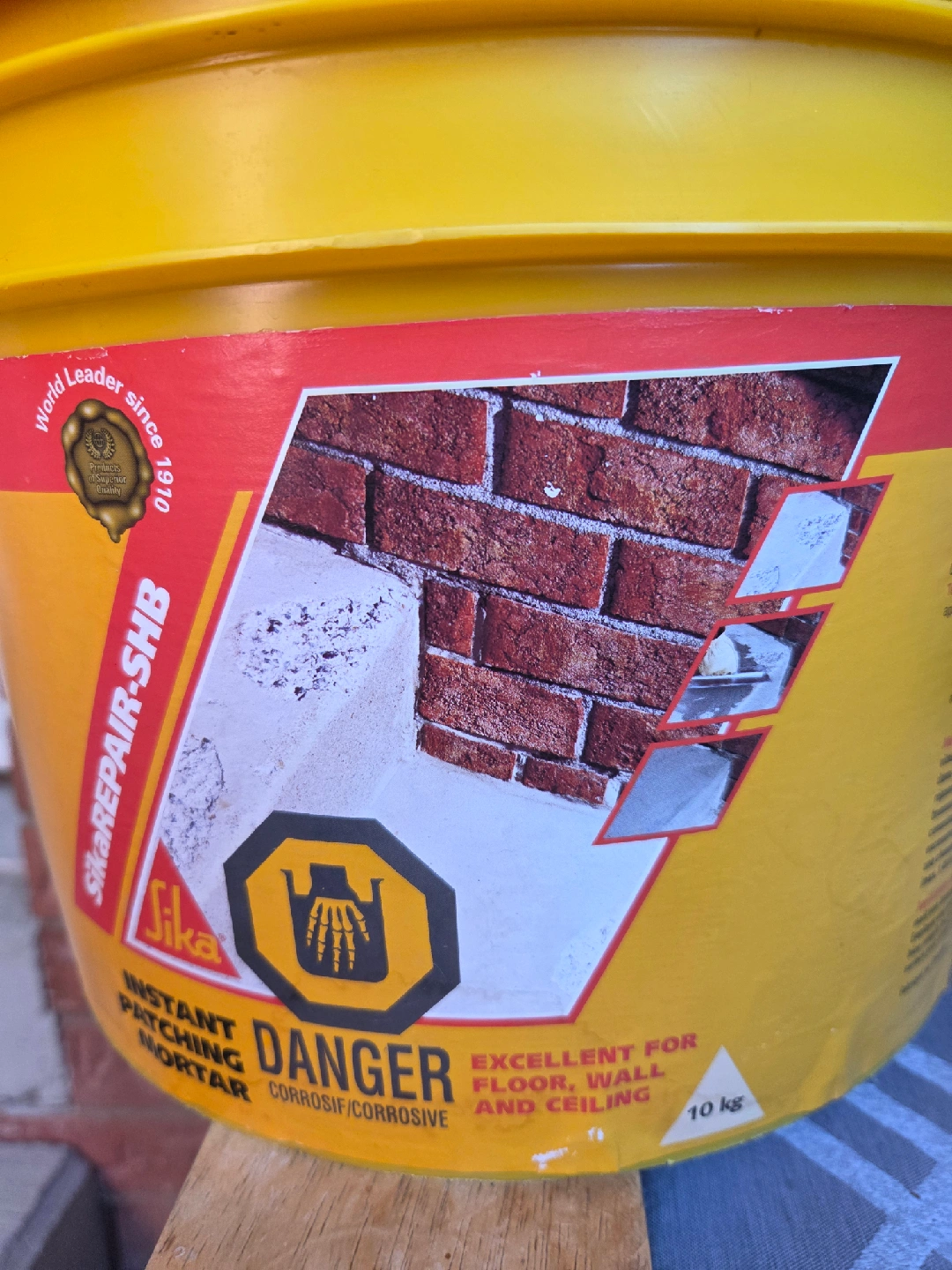 Selling a bucket of SikaREPAIR-SHB instant patching mortar. It's excellent for floor, wall, and ceiling repairs. The bucket contains 10 kg of mortar. never opened As is