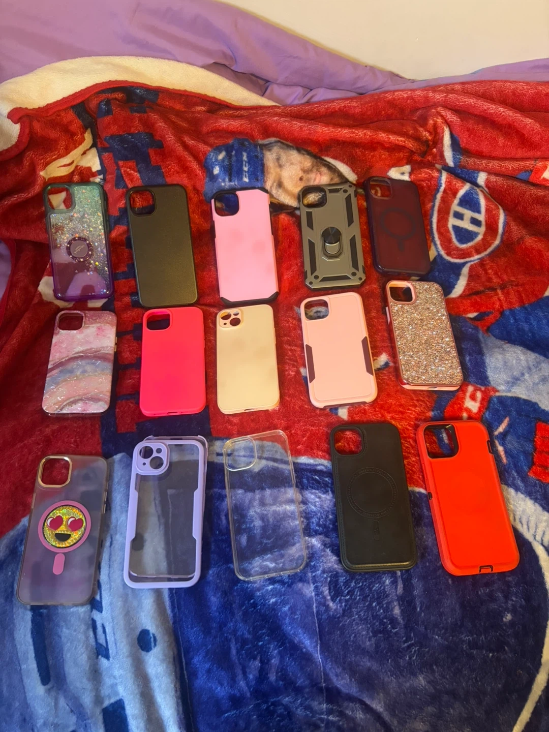 Collection of various iPhone cases in different colours and styles. Includes glitter, solid colours, and protective cases. For iPhone 15 plus. 2 of them are 2 piece cases, red one is otterbox style. Light pink is an otterbox. 50 for all, or 15 each