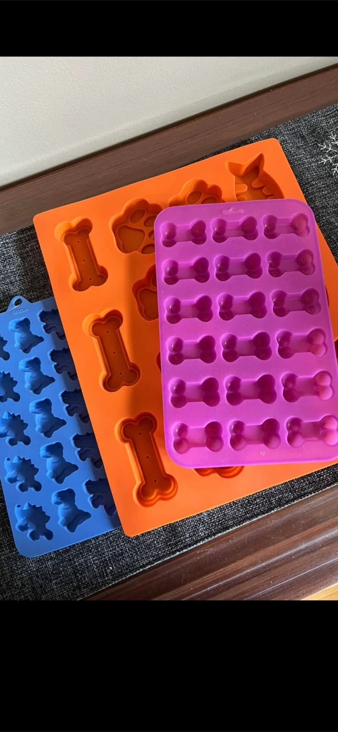 10Selling a set of silicone molds for making dog treats! Includes a dinosaur mold (blue), a bone and paw print mold (orange), and a bone mold (purple). Great for making homemade goodies for your furry friends