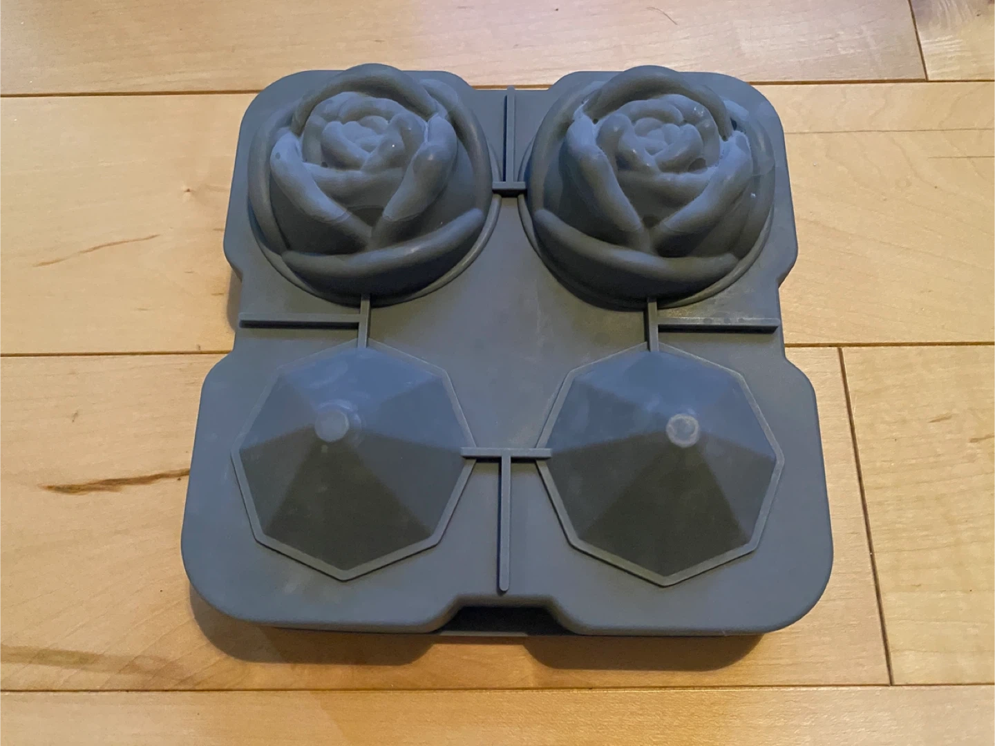 I'm selling a set of silicone ice cube molds! They're in great shape and ready to add a touch of elegance to your drinks. You'll get two molds: one with rose shapes and another with diamond shapes. Perfect for parties or just making your everyday drinks a bit more special