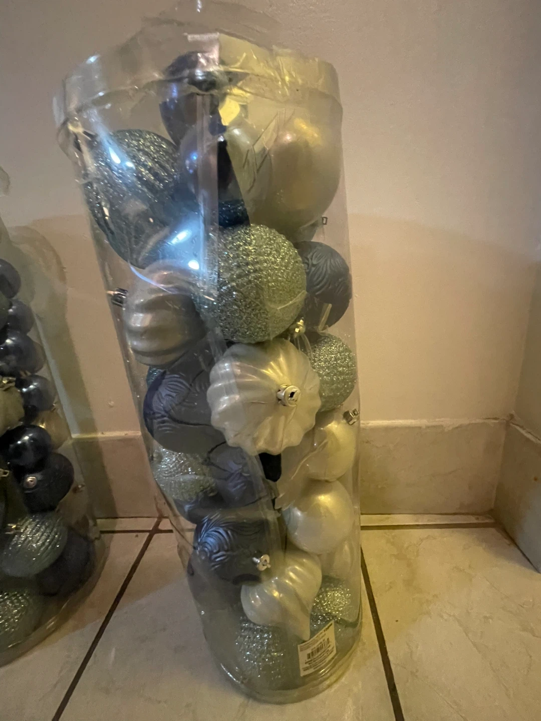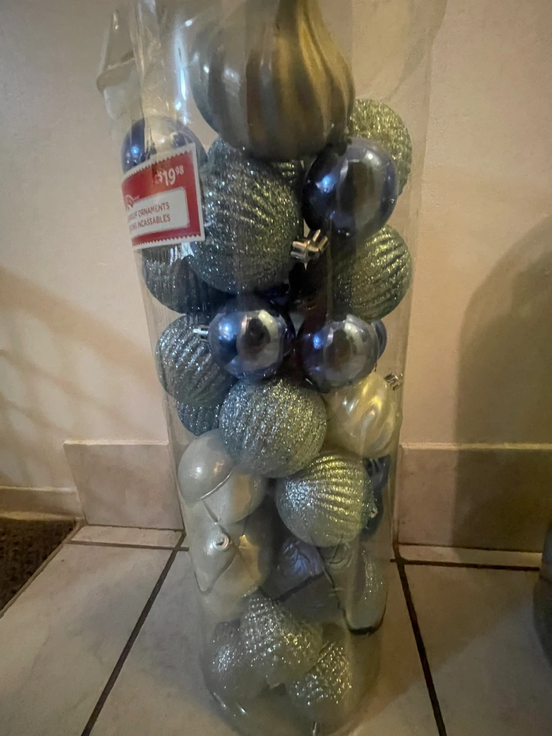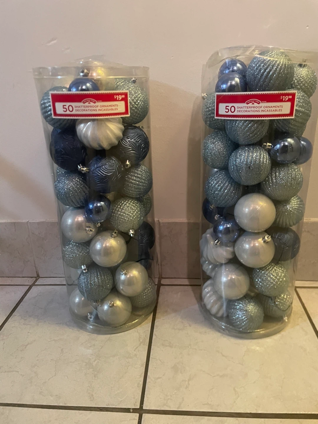 68Selling a set of Holiday Time shatterproof ornaments! The container includes 50 decorations in various shades of blue and silver.Originally bought both for 40 dollars selling it both for 20 dollars now, ornaments are in ok condition! Container of ornaments ripped open but can still hold the ornaments inside.