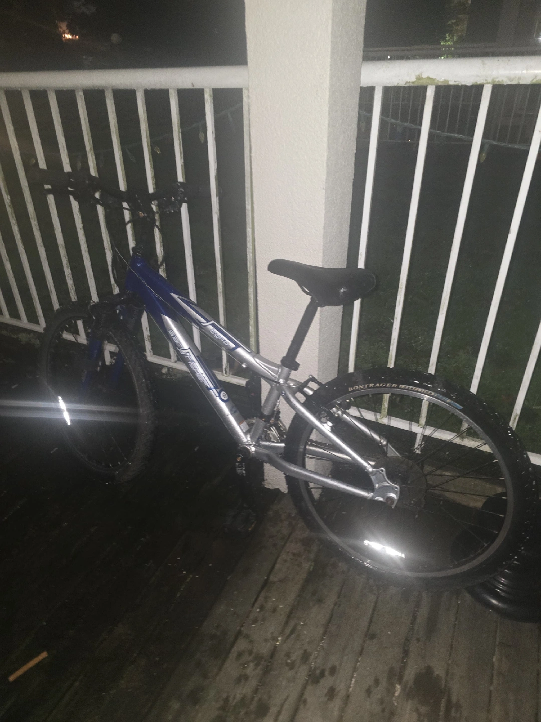 10Mountain Bike – $100 (OBO) Used mountain bike in good condition. Aluminum frame, Bontrager tires, everything works well. Selling because we’re moving and don’t need it anymore. 📍 Location: 13929 101 Ave, Surrey, BC 💲 Price: 70 (or best offer)Selling a mountain bike with a silver frame and blue accents. The tires are Bontrager. It's in good condition and ready for some new adventures!