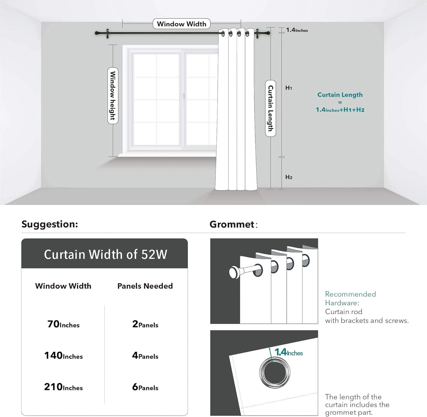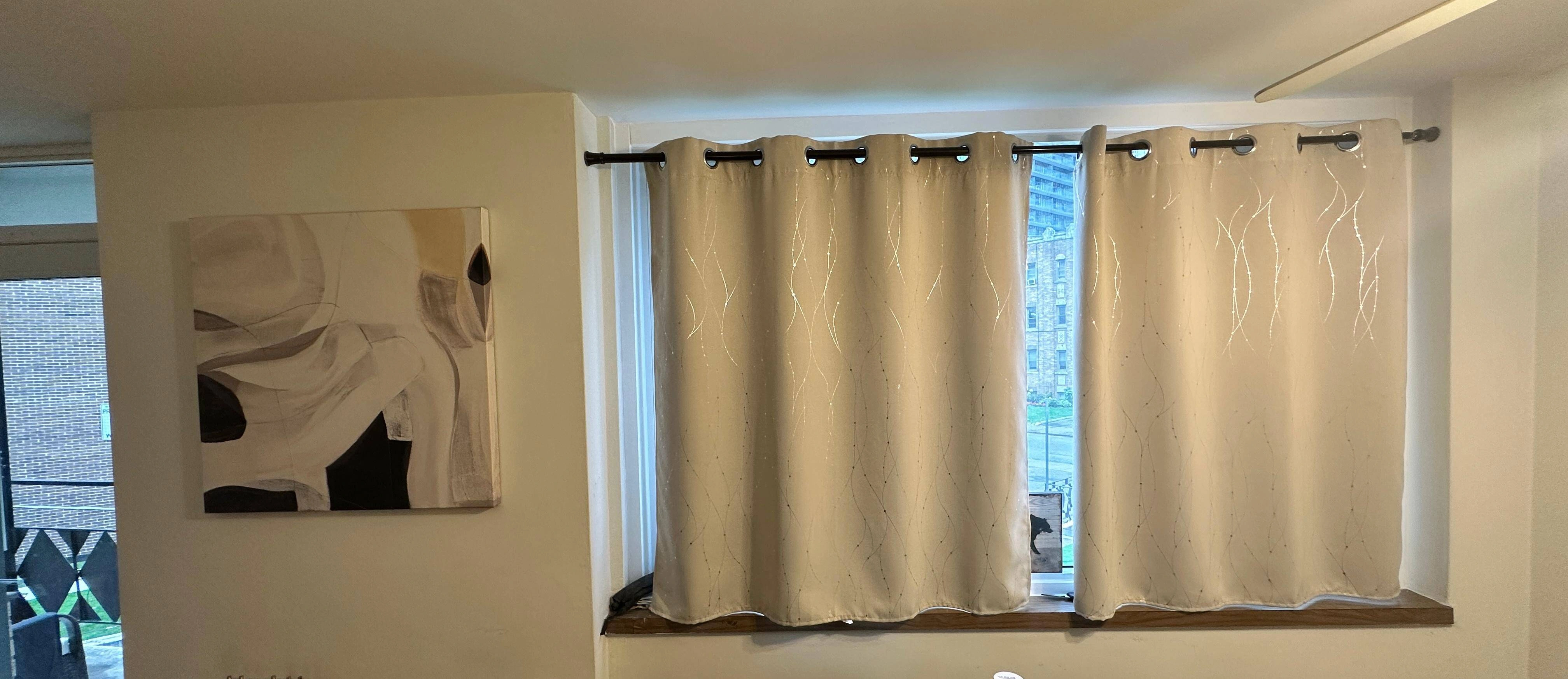 Selling a set of 2 blackout curtains in a stylish silver-beige tone. - Includes a FREE adjustable curtain rod - Excellent condition, no stains or damage. - Each panel measures 52” W × 54” L - Great for blocking sunlight and reducing noise - Perfect for bedrooms, living rooms, or home offices