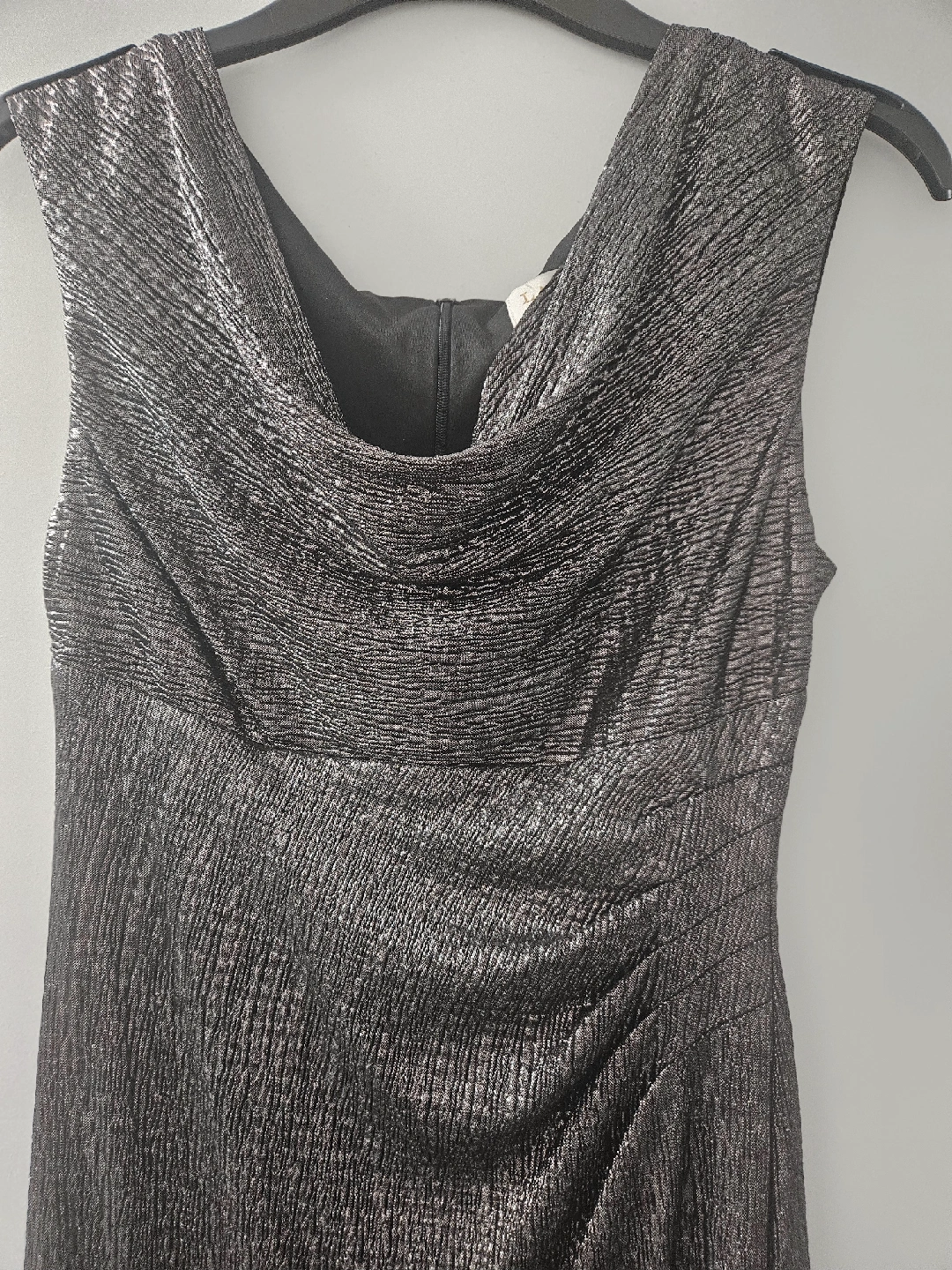 Selling a formal, silver, iridescent dress with a grecian neckline. It has a unique textured pattern that gives it a shimmering effect. Perfect for a night out or a special occasion!