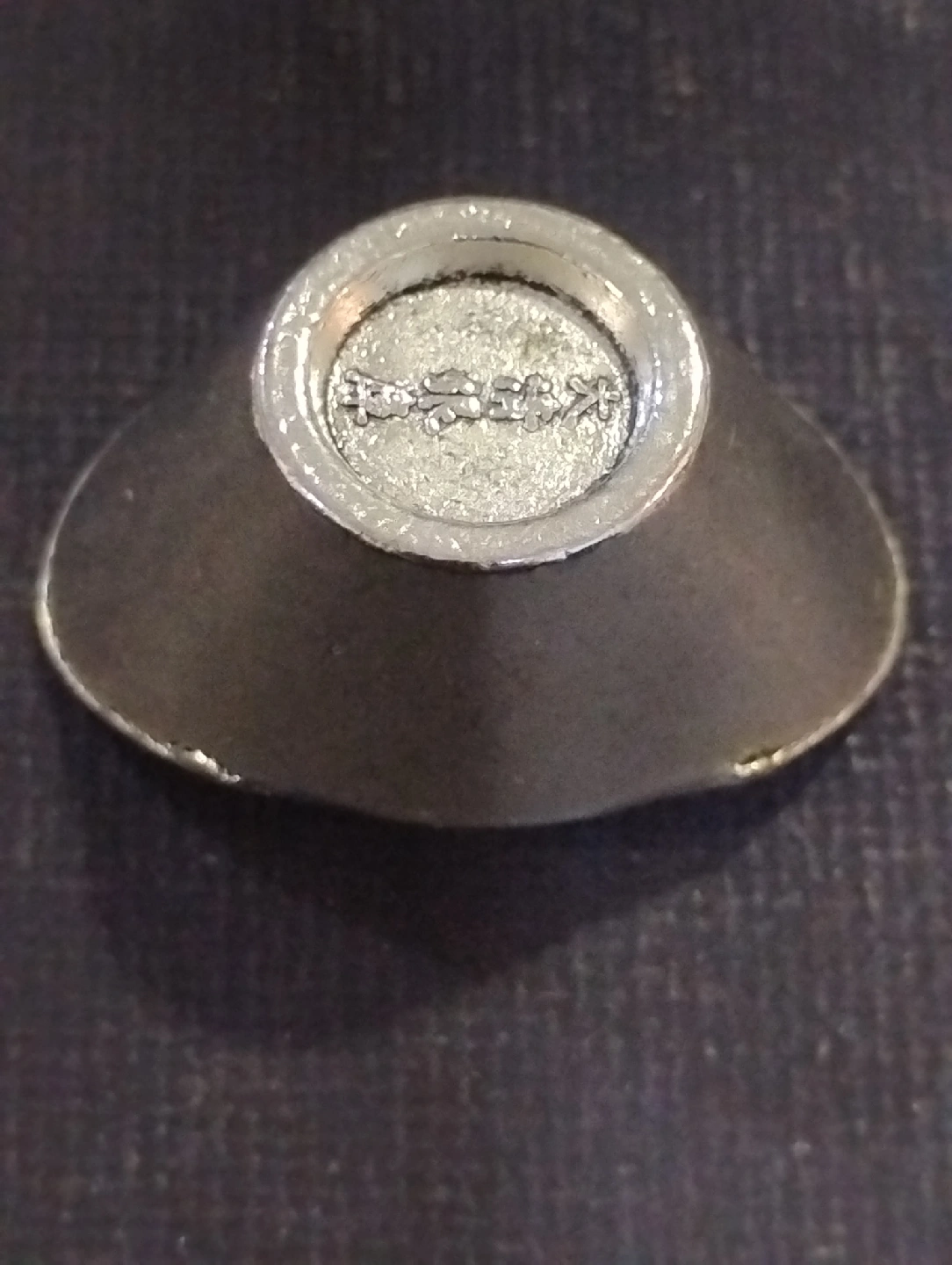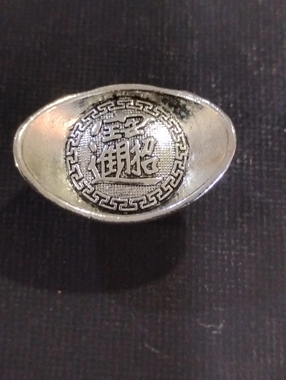 290Selling a silver-coloured Chinese ingot. It has some intricate designs on it. It could be a nice addition to your collection or used as a decorative piece!