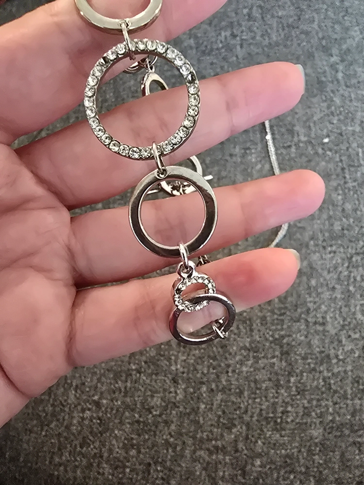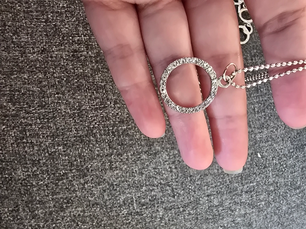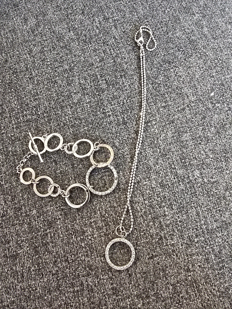 Selling a lovely silver-tone necklace featuring a circle pendant, like new condition. plus a matching bracelet good condition. bracelet has a couple stones missing. It's in great condition and would make a beautiful addition to any outfit. sold as a pair.