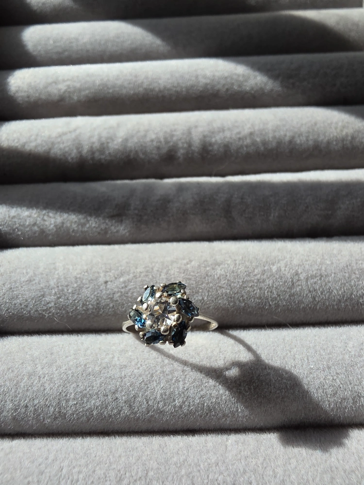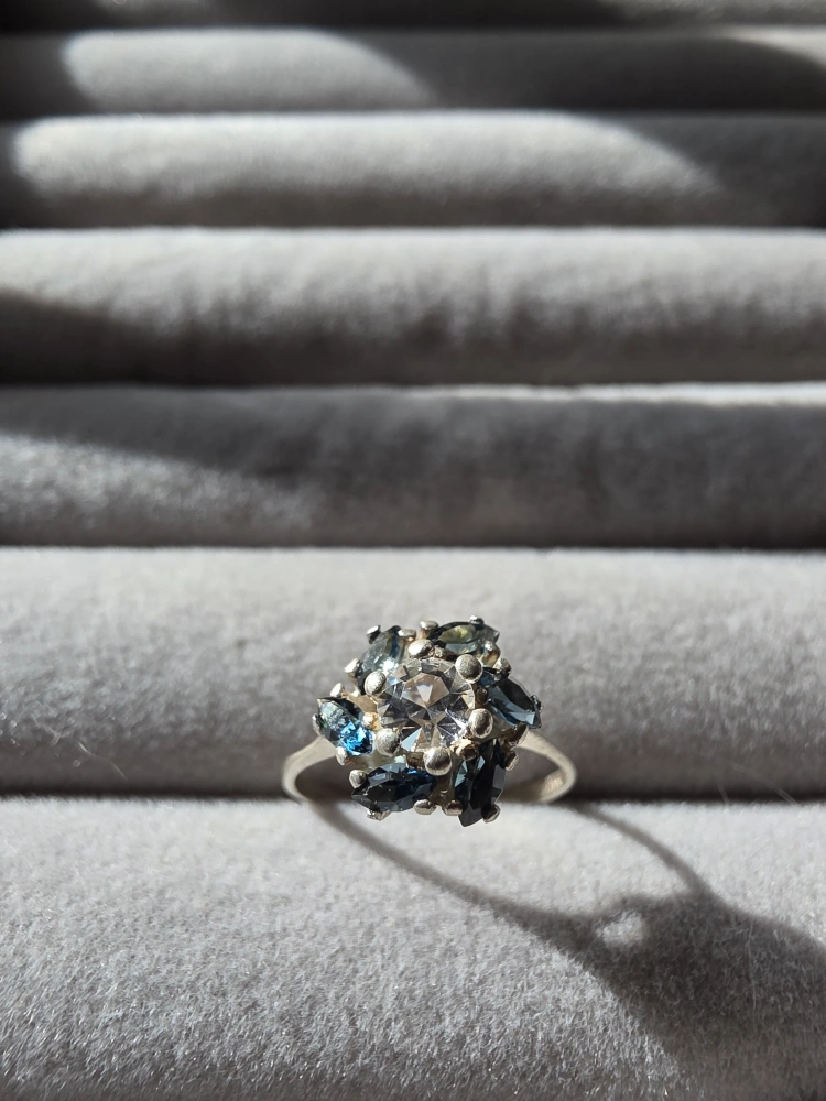 96Selling a silver cocktail ring with blue and clear stones. It's a beautiful piece that would make a great addition to any jewelry collection