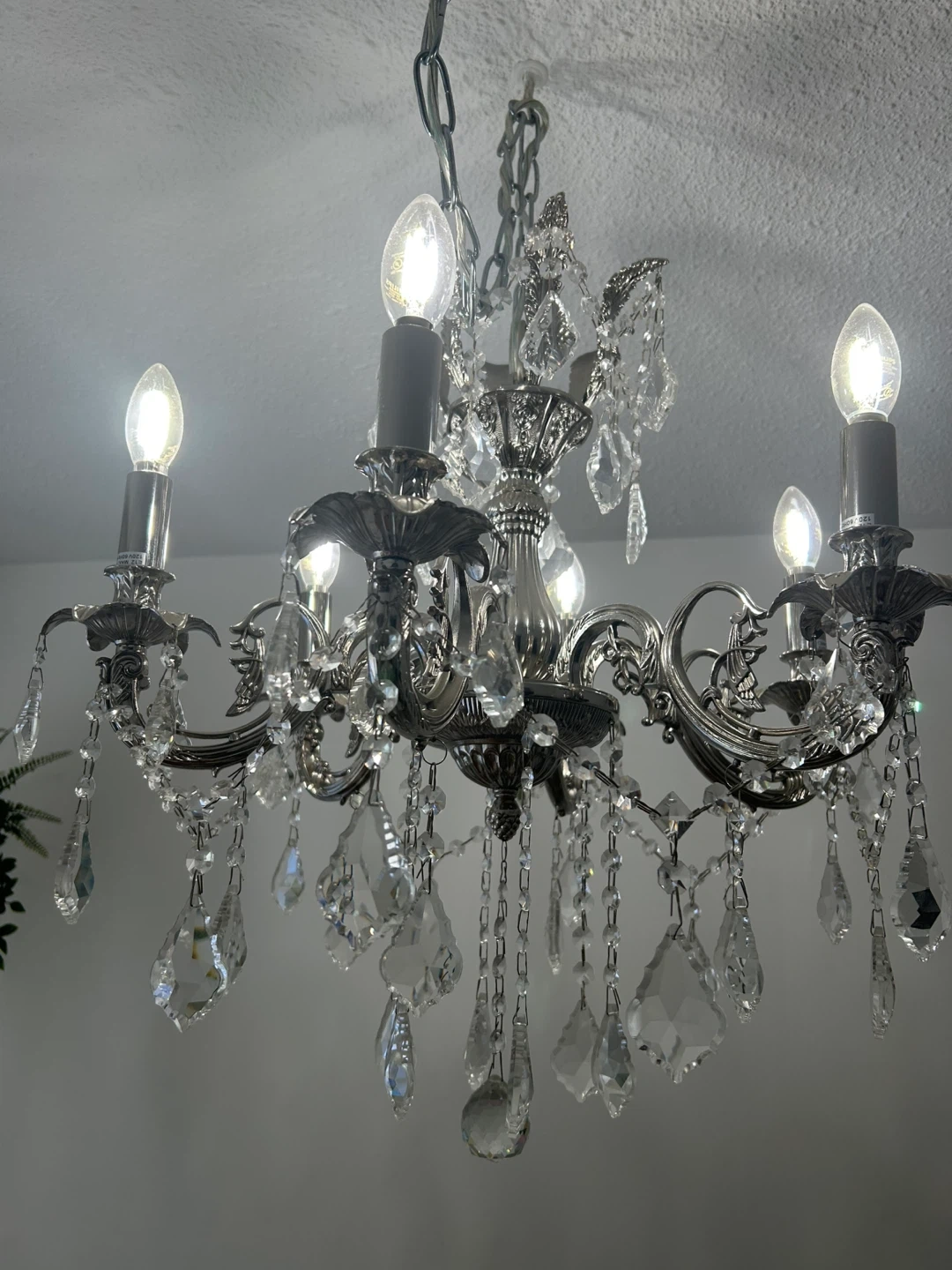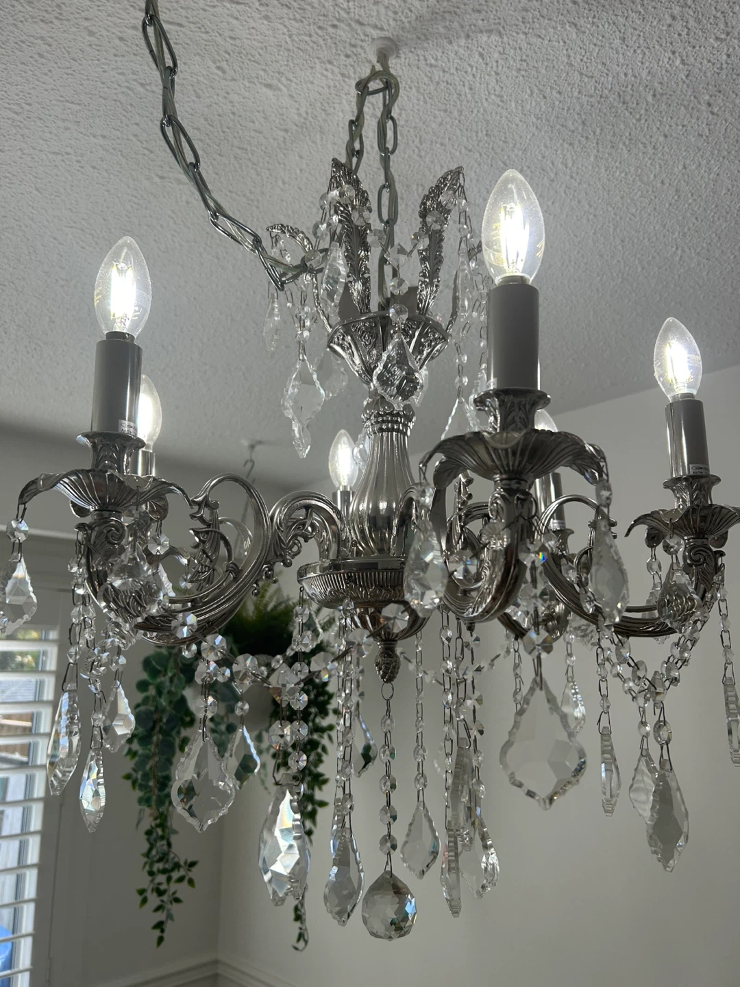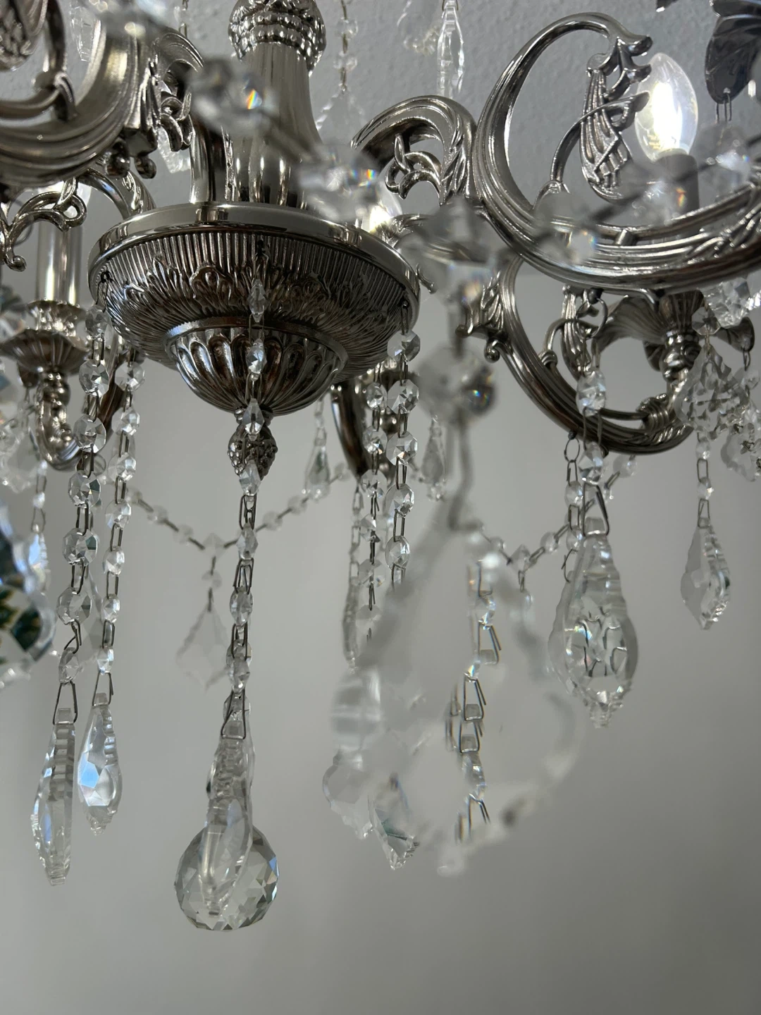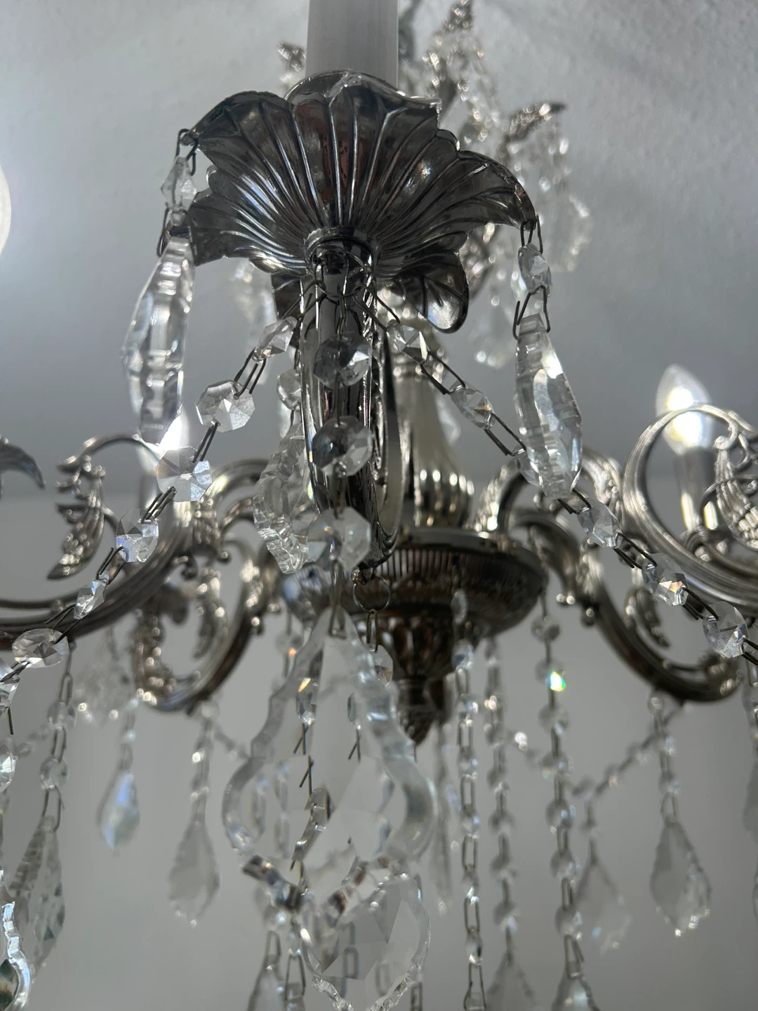15Beautiful silver chandelier with crystal accents! It's in great condition and would add a touch of elegance to any room