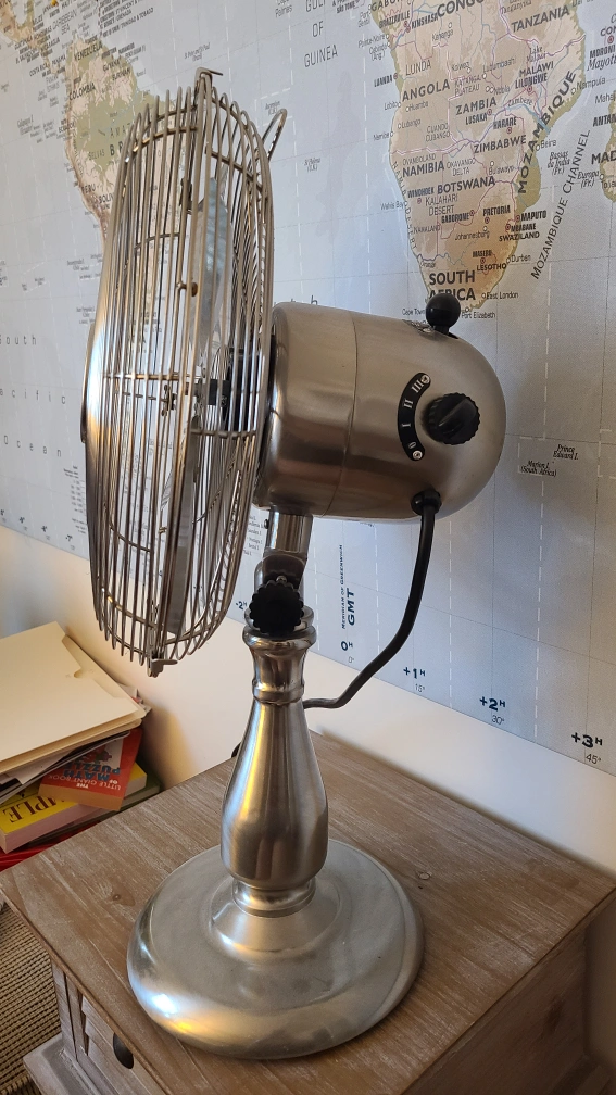 21Selling a vintage-looking brushed silver oscillating desk fan (3 speeds]. It's in great condition and perfect for keeping cool on hot days.