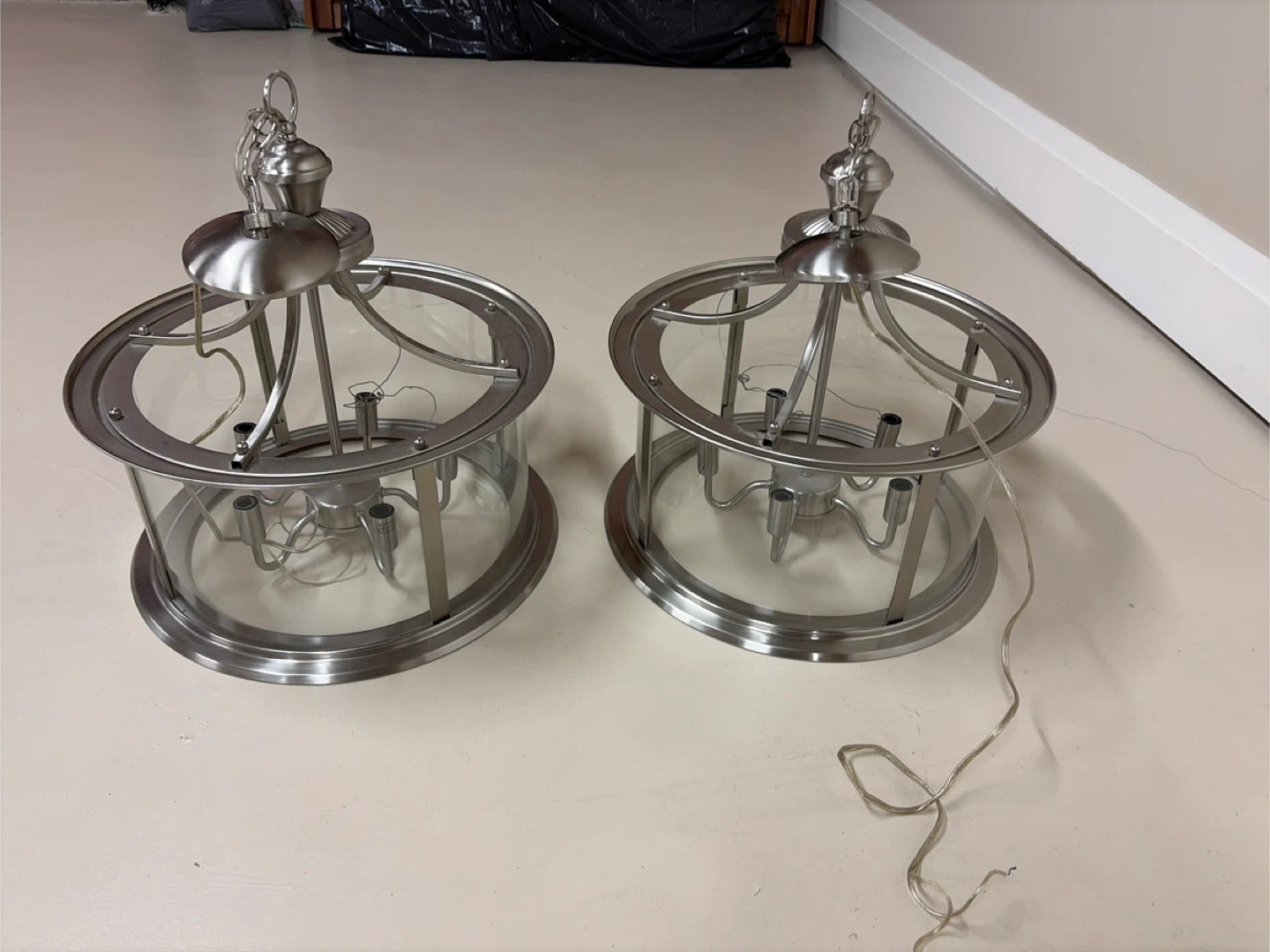 60Here are two pendant lights with a silver finish and glass enclosures. They are in good condition and would be a great addition to any room. Ready to brighten up your space. (Need your own LED lights.