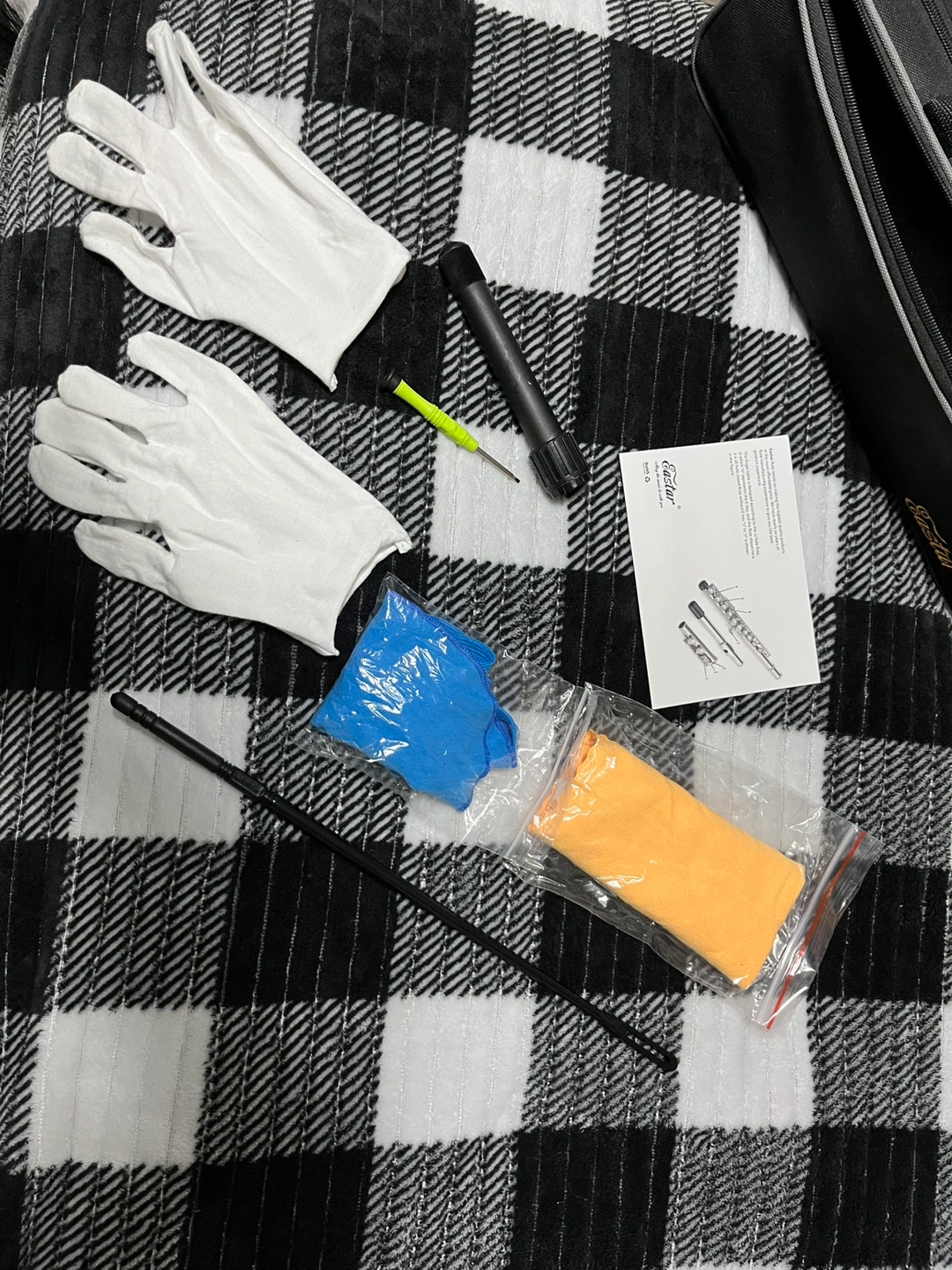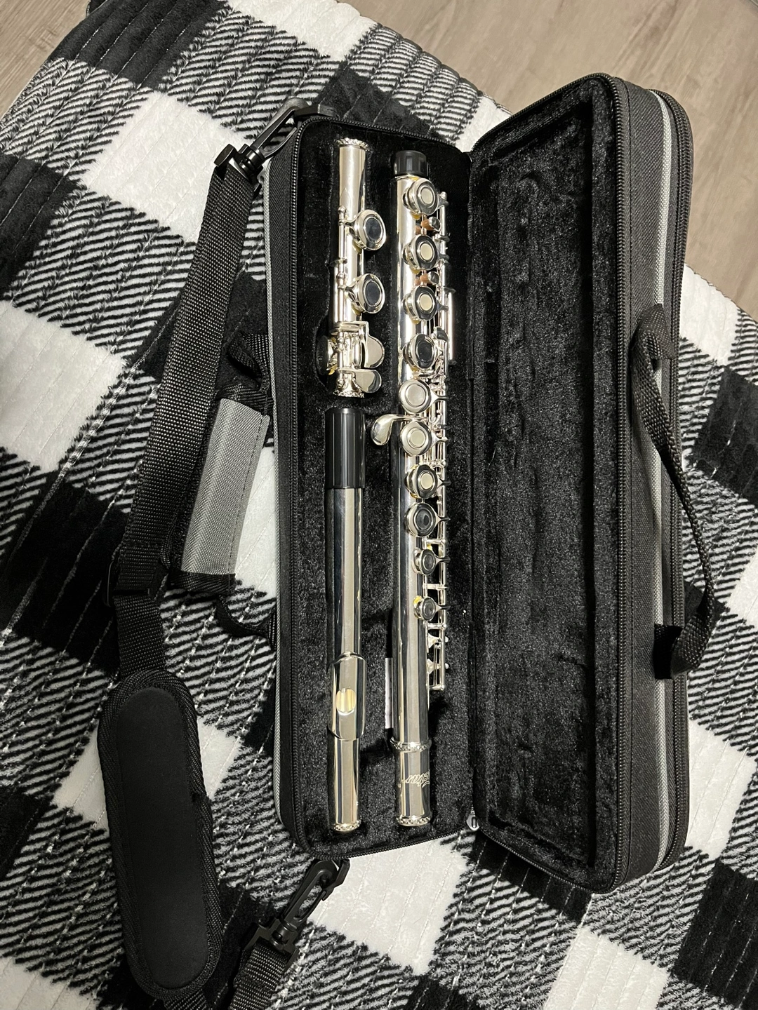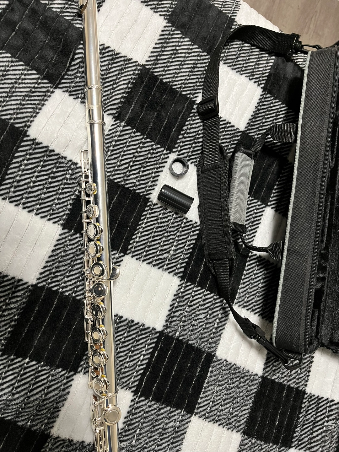 115This listing is for a silver flute with a case and accessories. Included are cleaning supplies, a cleaning rod, gloves, and a case. The flute is a beginner level 16 holes C key instrument.