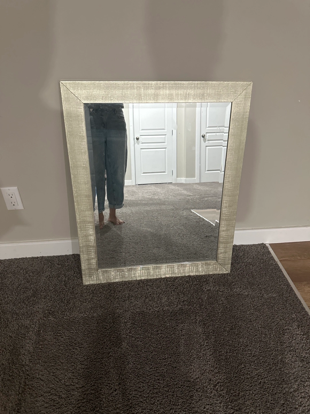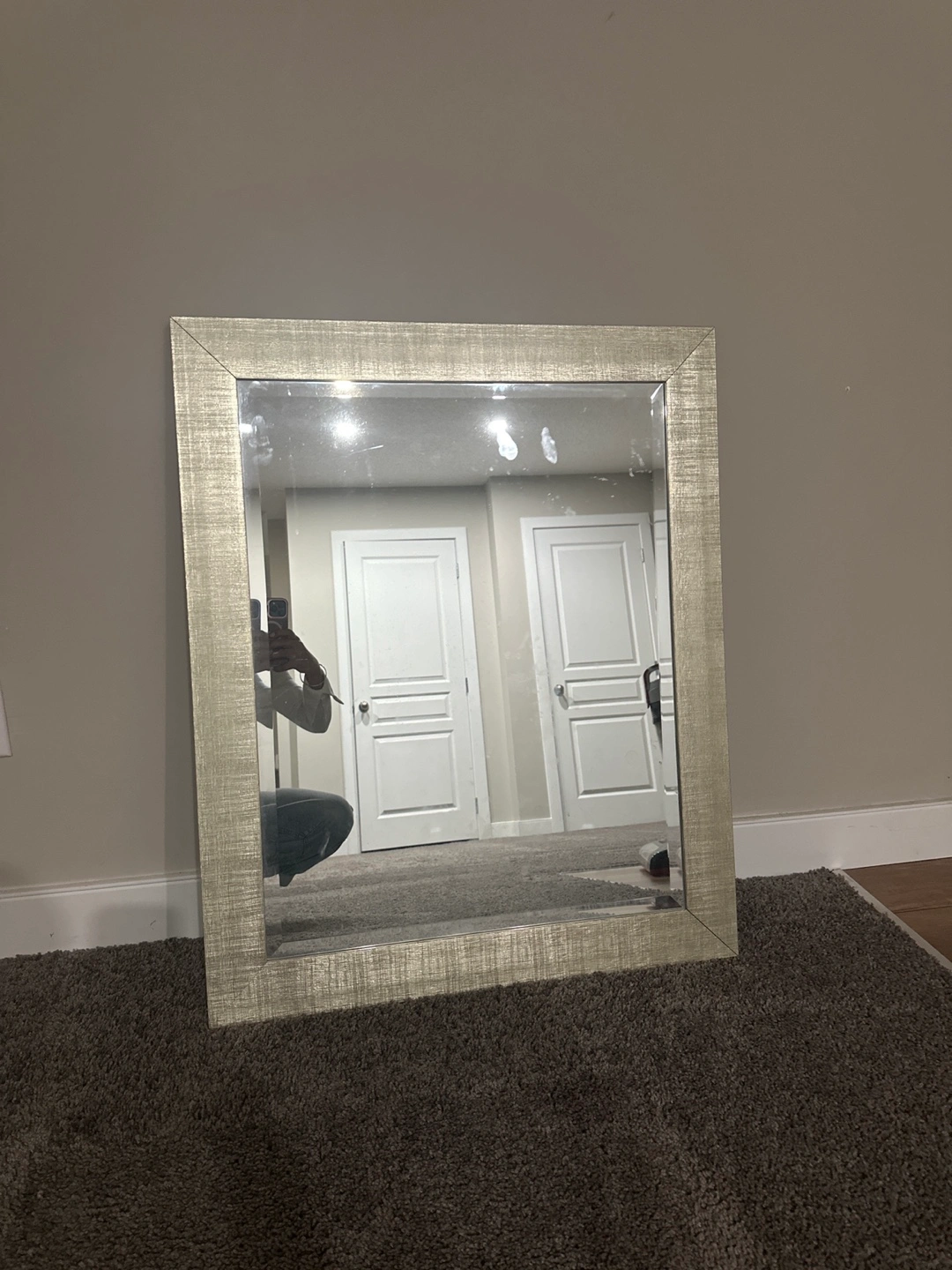 Large rectangular mirror. Silver frame. Great for a bedroom or hallway. Good condition. Never used