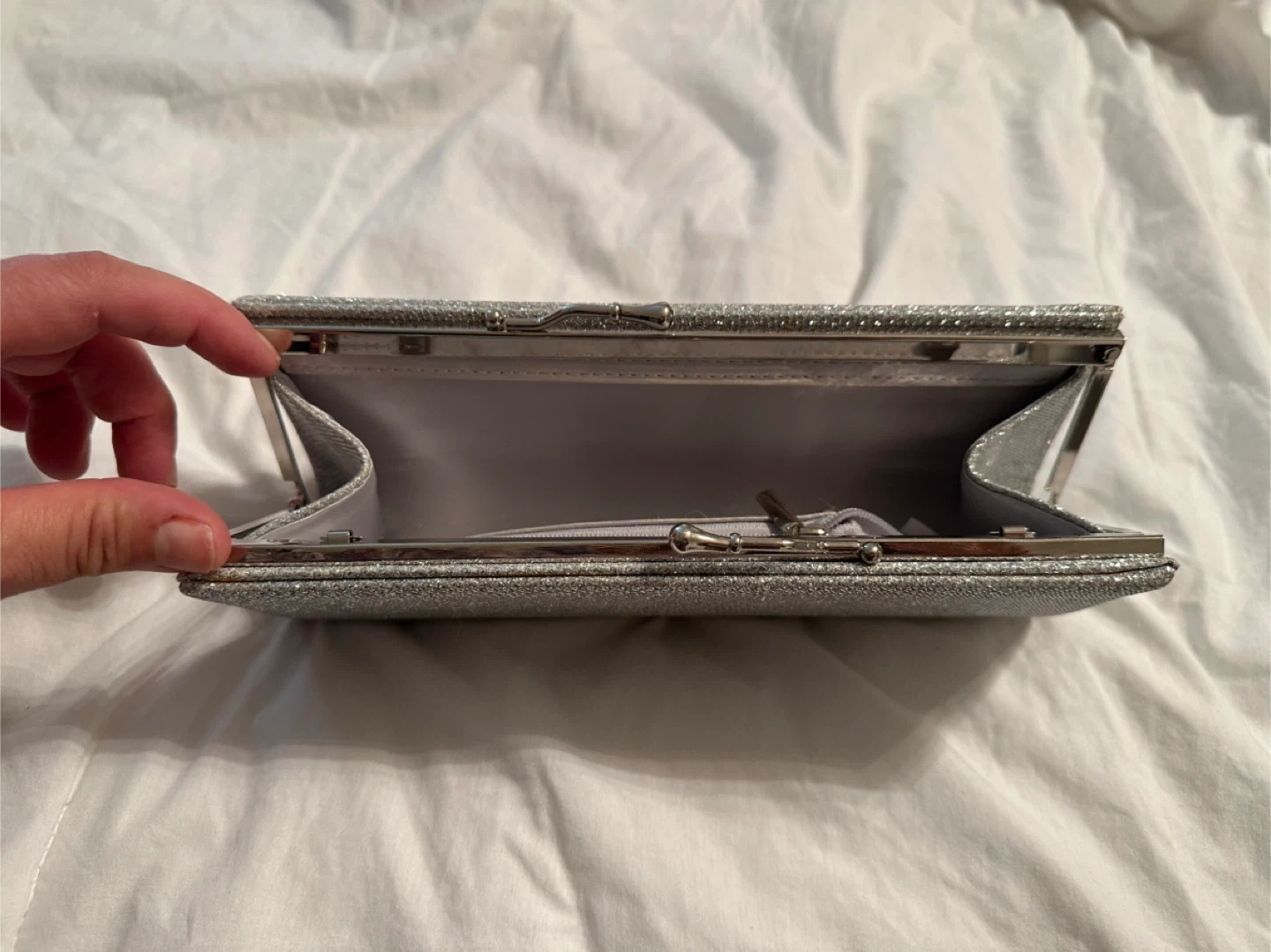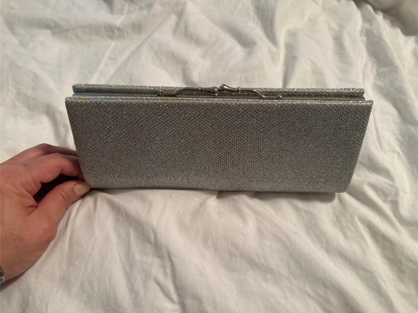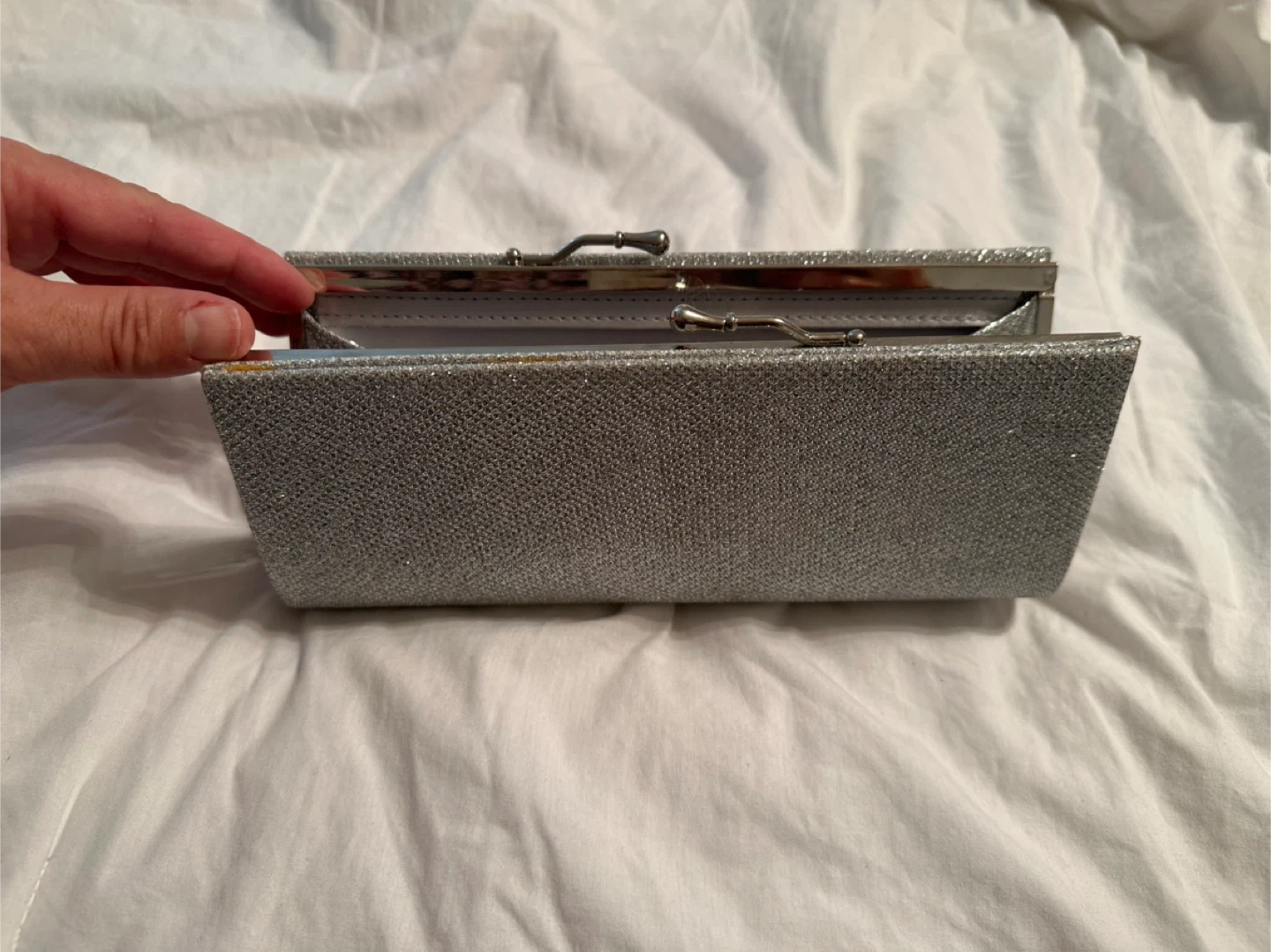 10Selling a cute silver glitter clutch purse. It's perfect for evenings out or special occasions. It's in great condition and ready for a new home!