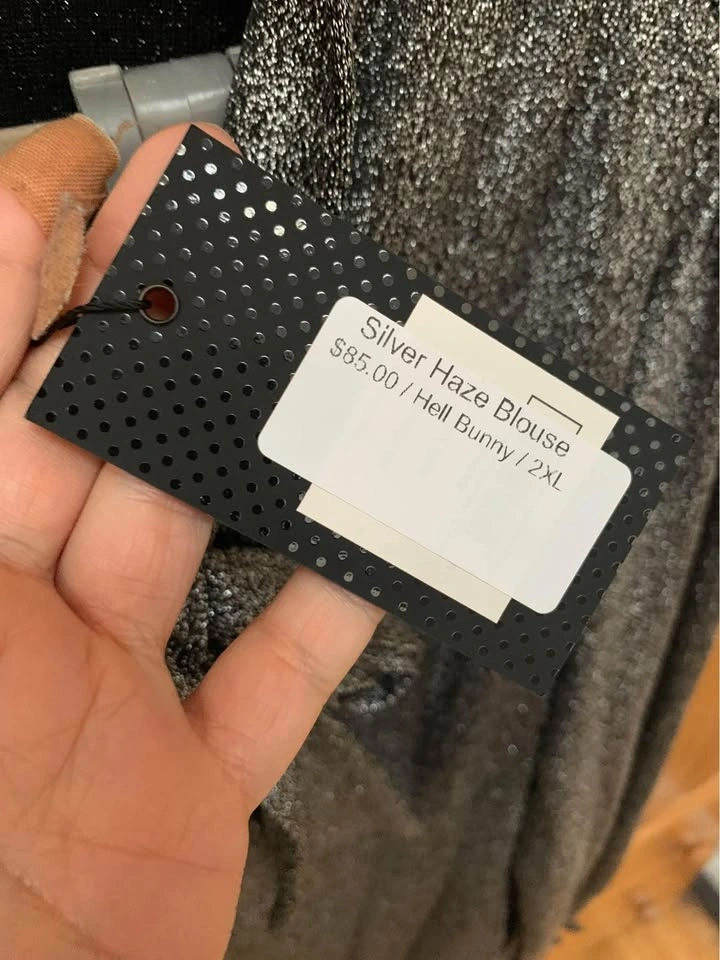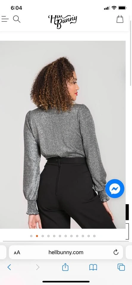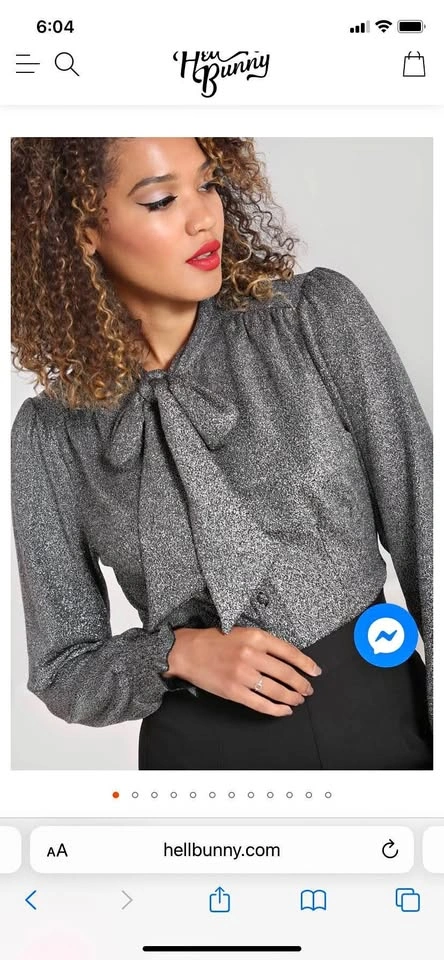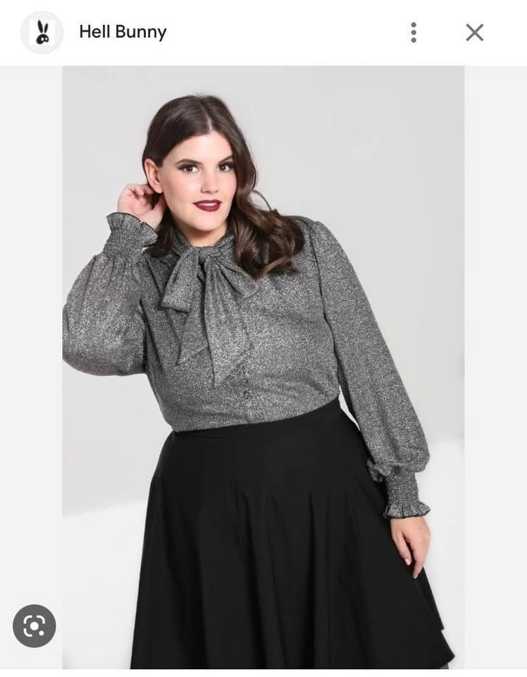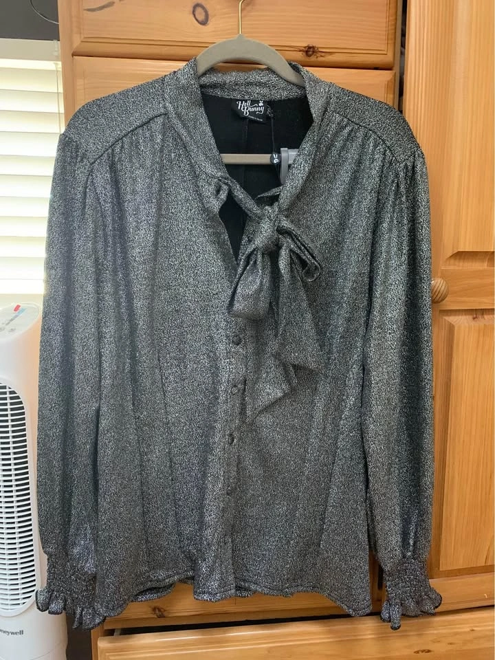 65Fabulous BNWT Hell Bunny top on 2xl (see size chart- very stretchy fabric so can be sized up or down). Silver lurex semi-fitted blouse with large tie detailing at the neck for added glam Long draped 'bishop' style sleeves for more drama! Shirred cuffs at the bottom of the sleeves with added frill detailing Buttons to fasten Length reaches the hips - can be styled tucked in or out Fabric content: 53% Nylon 43% Polyester 4% Elastane Yours for $50 Smoke free cat friendly home at Queen and Jones