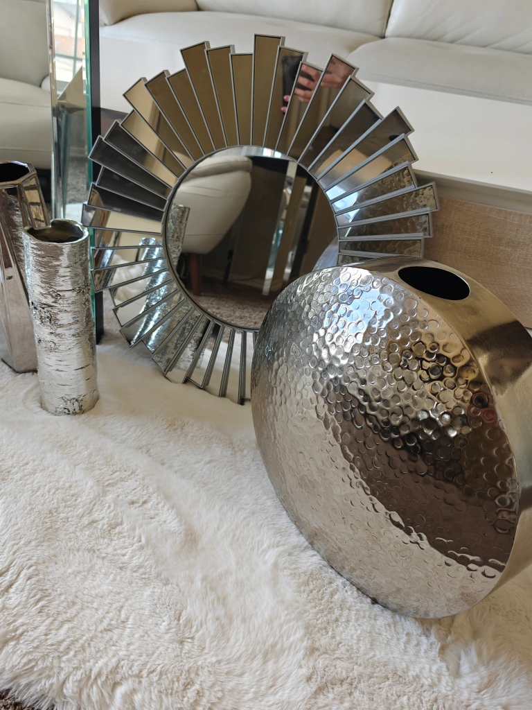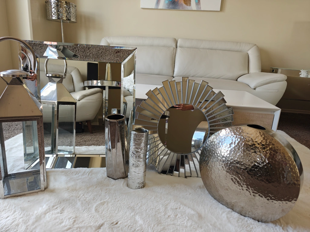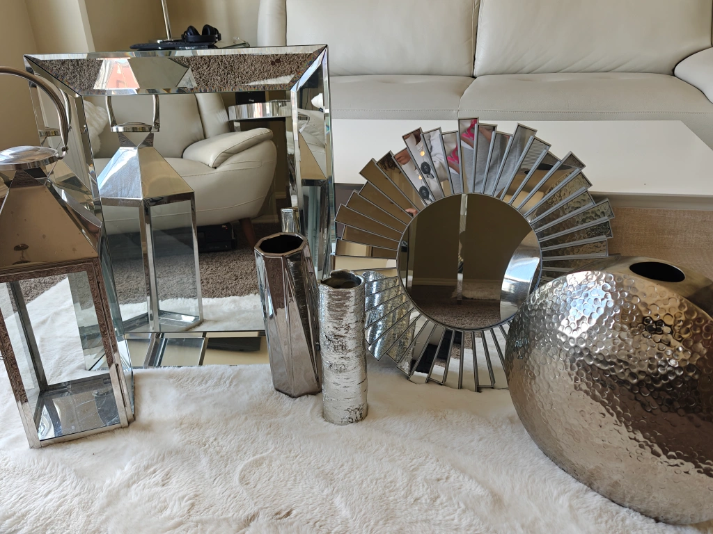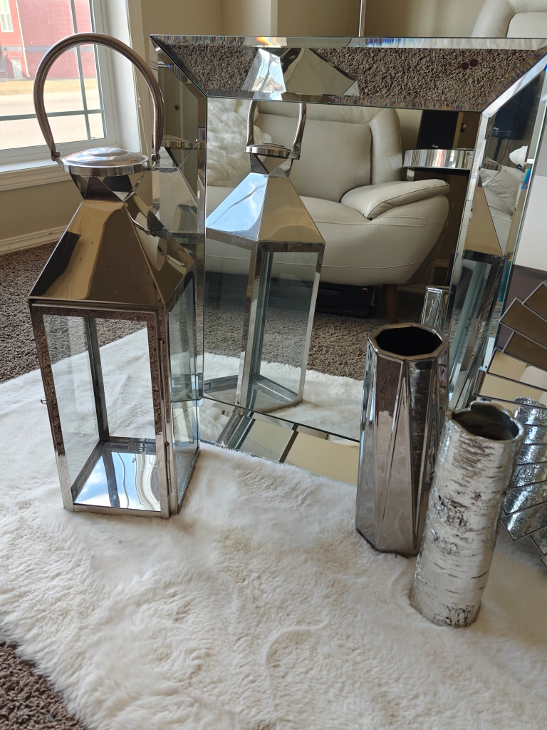 0Stunning silver home decor bundle. Includes two mirrored wall accents, a large hammered metal vase, two silver metal lanterns, and two decorative vases. Perfect for adding a touch of glamour to your living space. Some minor imperfections on the larger mirror.