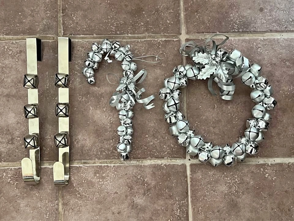 Silver Wreath, Candy Cane, plus two over-the-door hangers. Wreath&Cane, are 12” in diameter/height. Hangers are 14”. Pickup in Courtice.