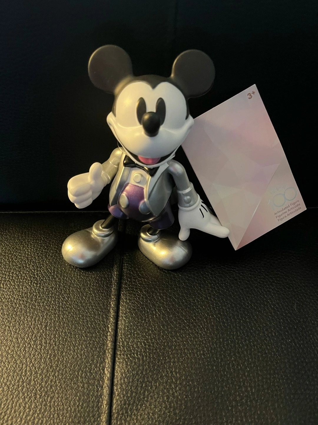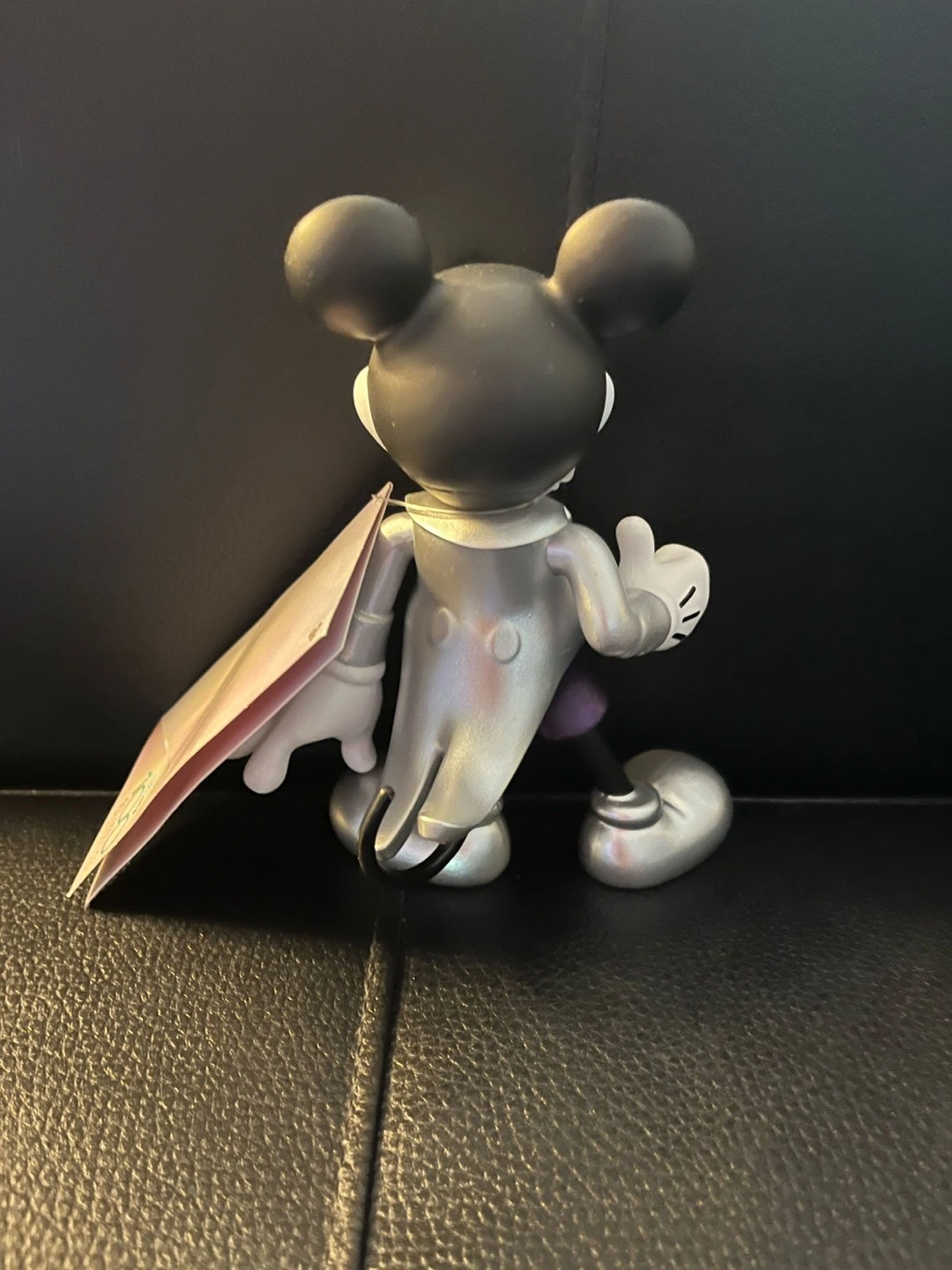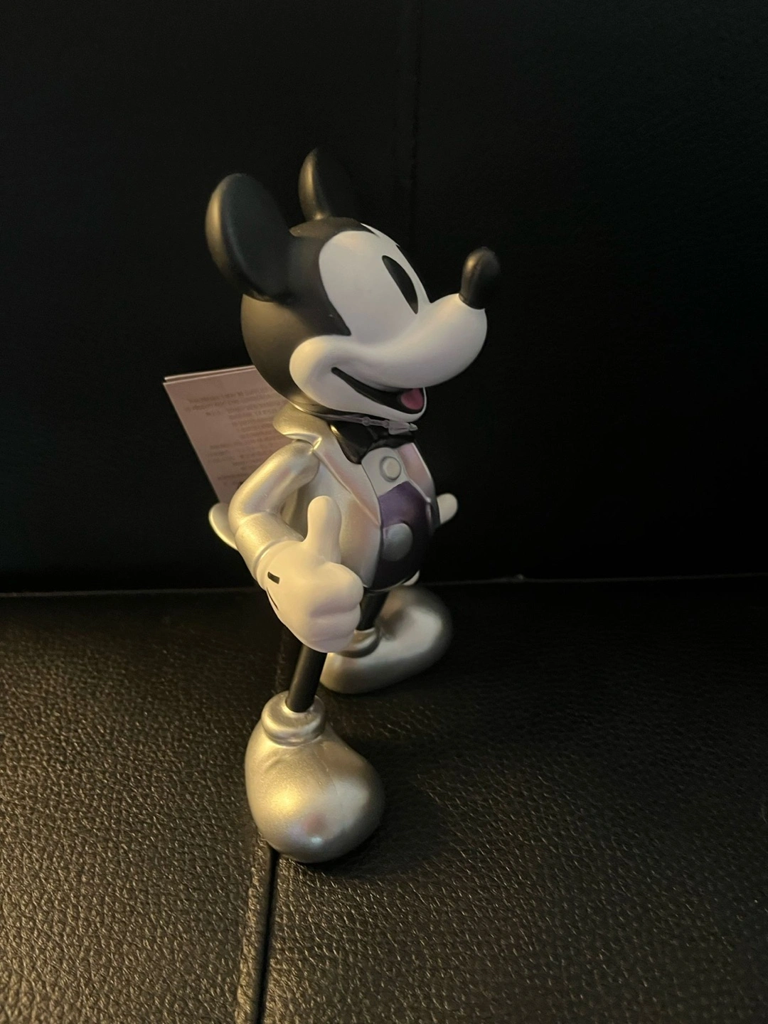 65Collectible Mickey Mouse figurine. Silver metallic finish. Wearing a tuxedo. Looks like new. Small size, perfect for display.