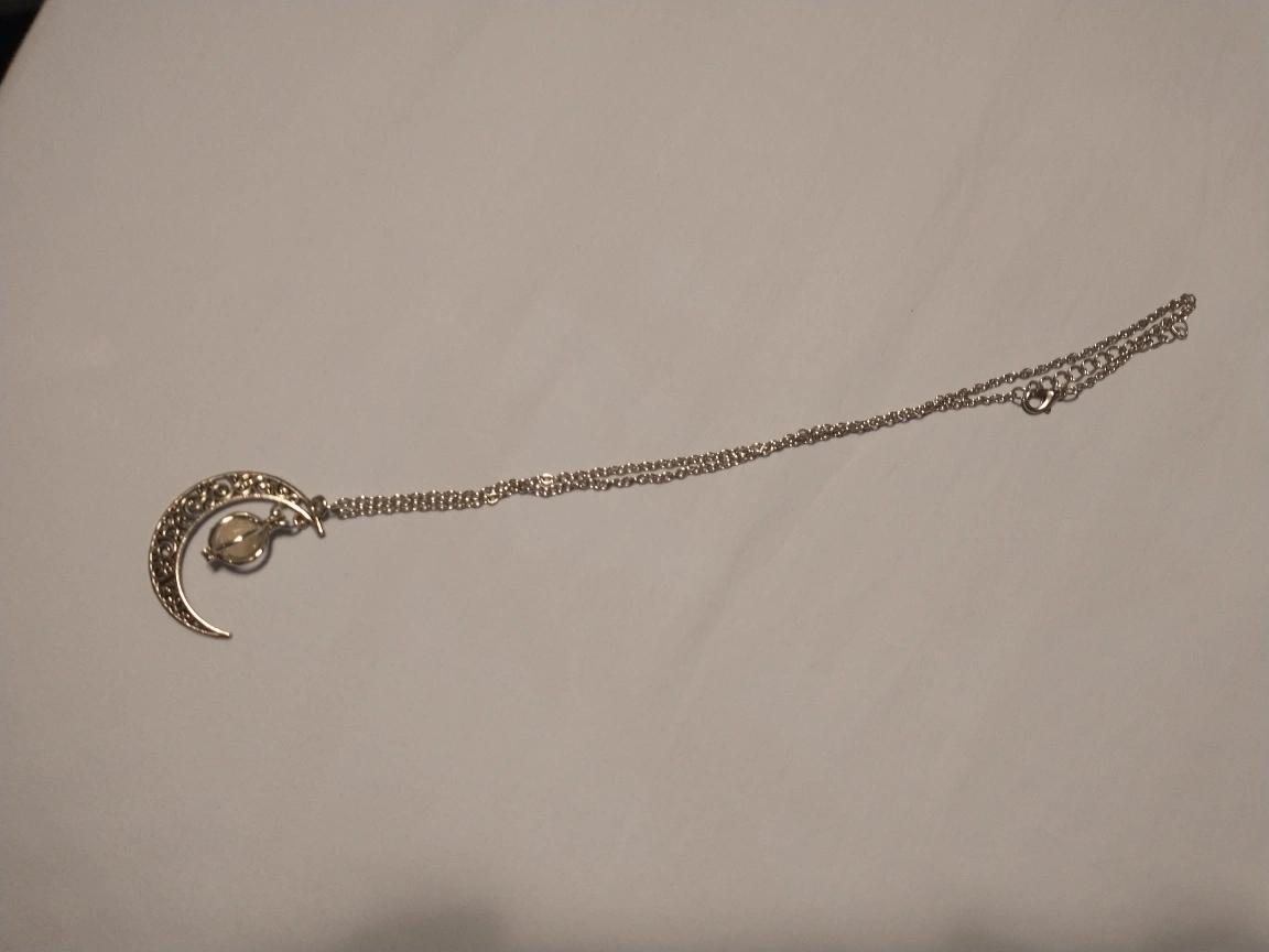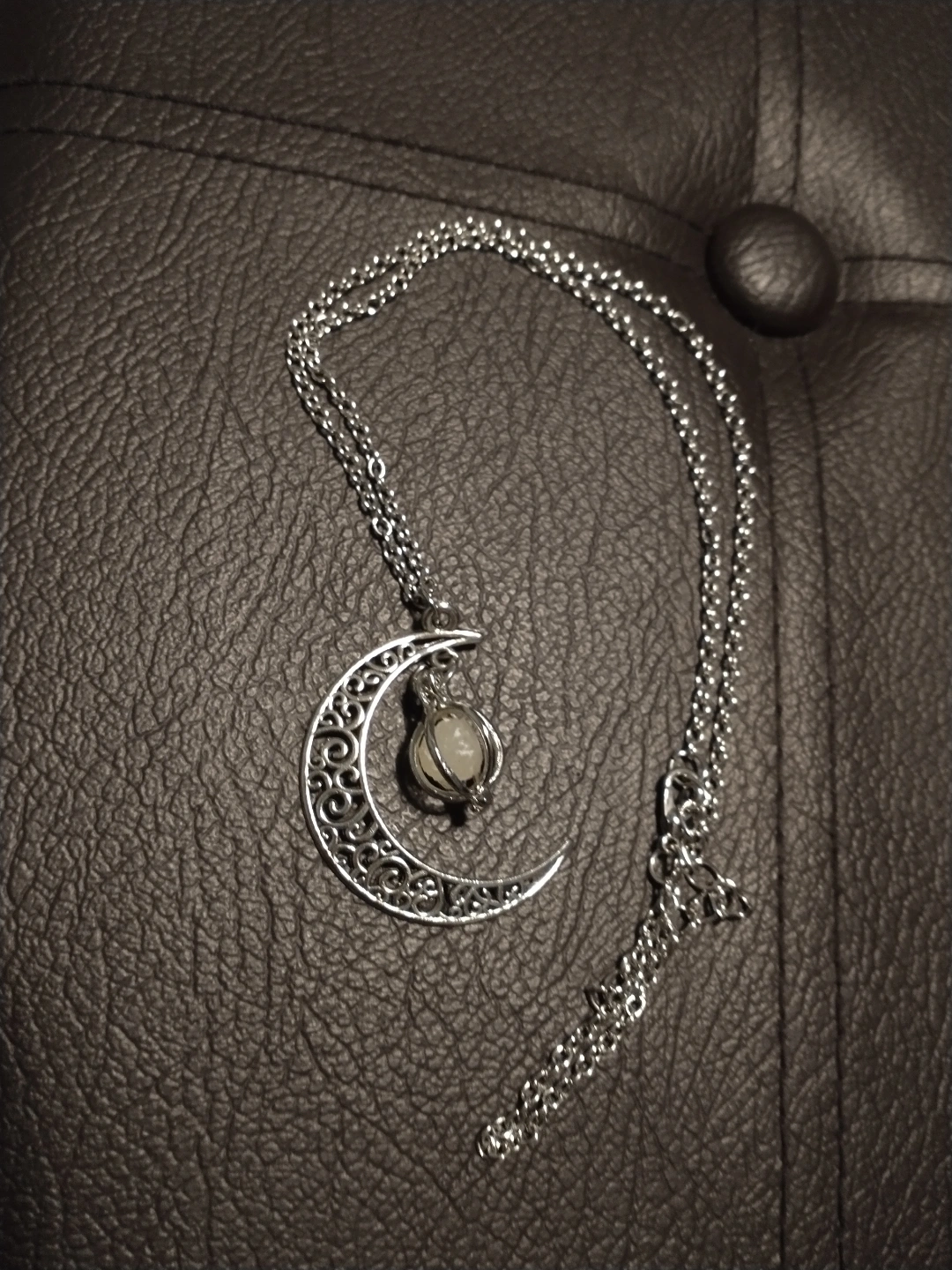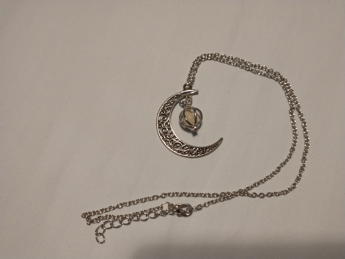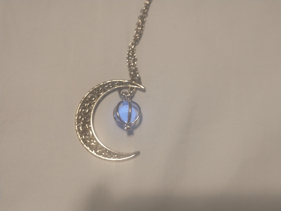 Silver chain necklace with moon and glow in the dark gem The gem glows a light blue Chain is 46cm/18" with an extension Cash payment or open to trades