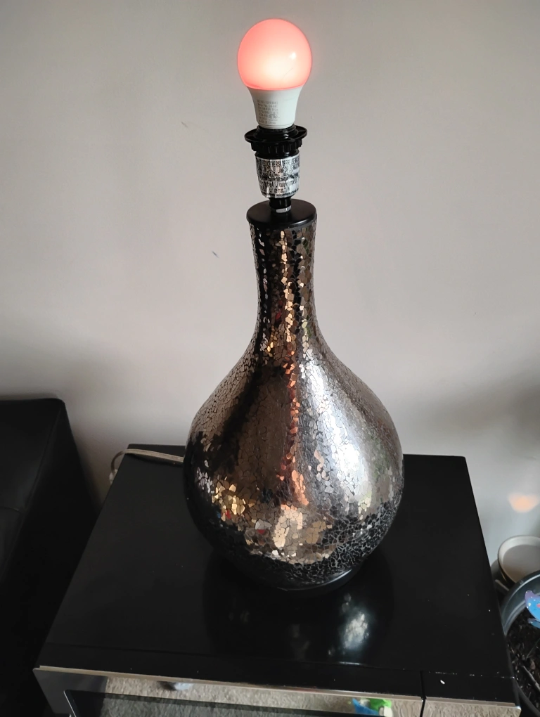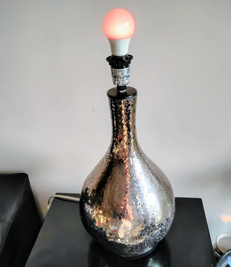 Add a touch of sparkle to your space with this unique silver mosaic table lamp! It comes with a red light bulb, creating a warm and inviting ambiance. Perfect for a bedside table or living room accent