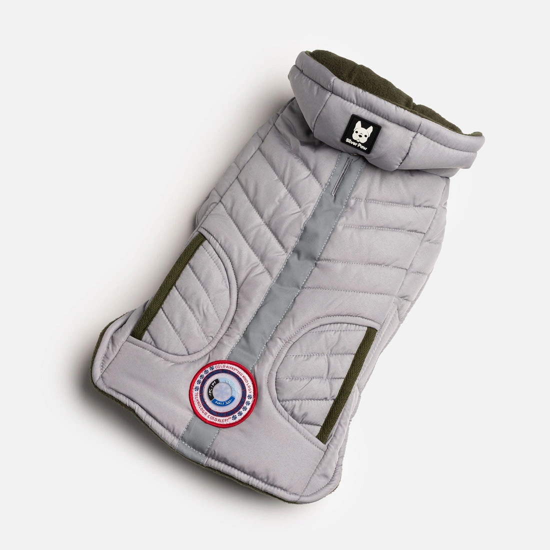 18Grey quilted dog puffer jacket. Features olive green interior fleece lining and accents. Includes a hood. Lightweight and warm.
