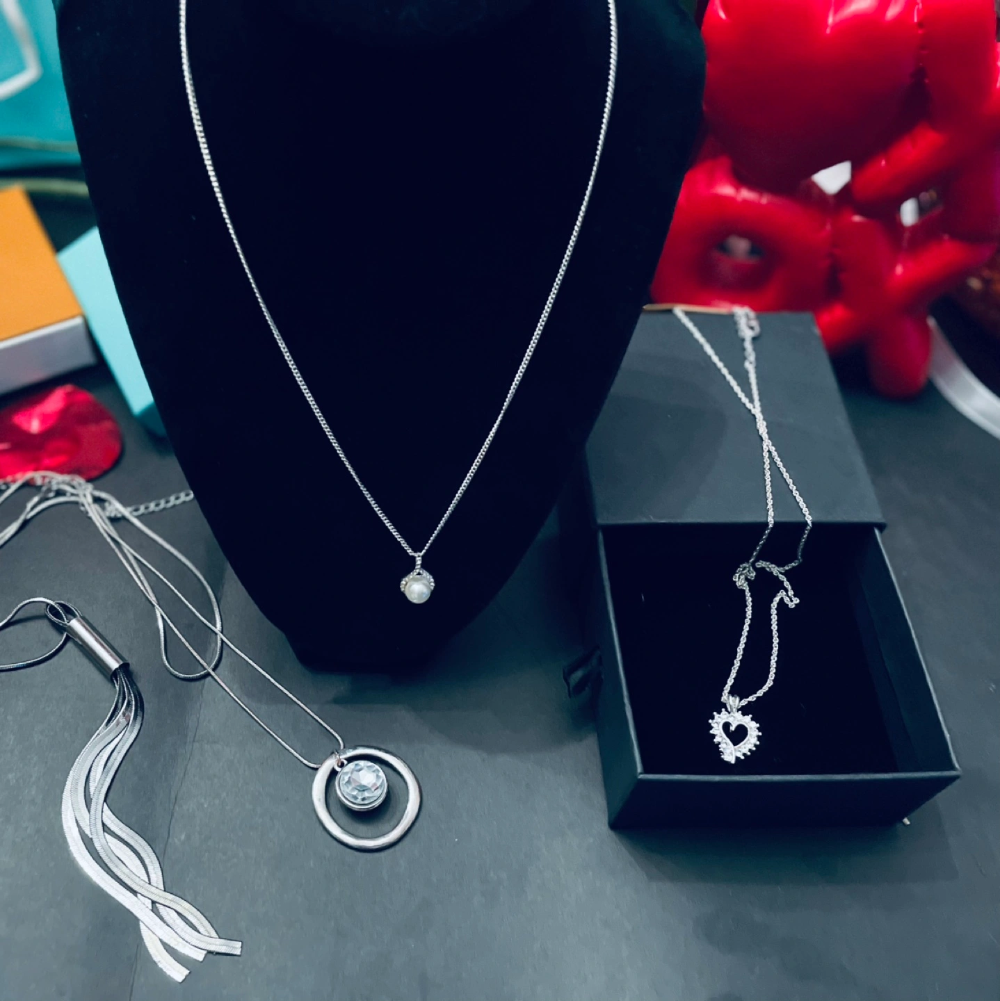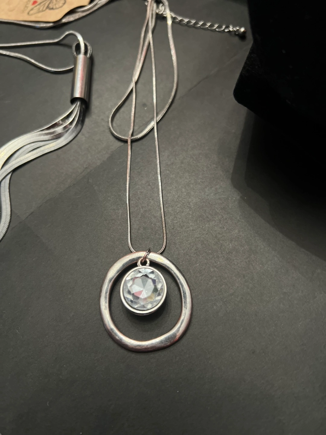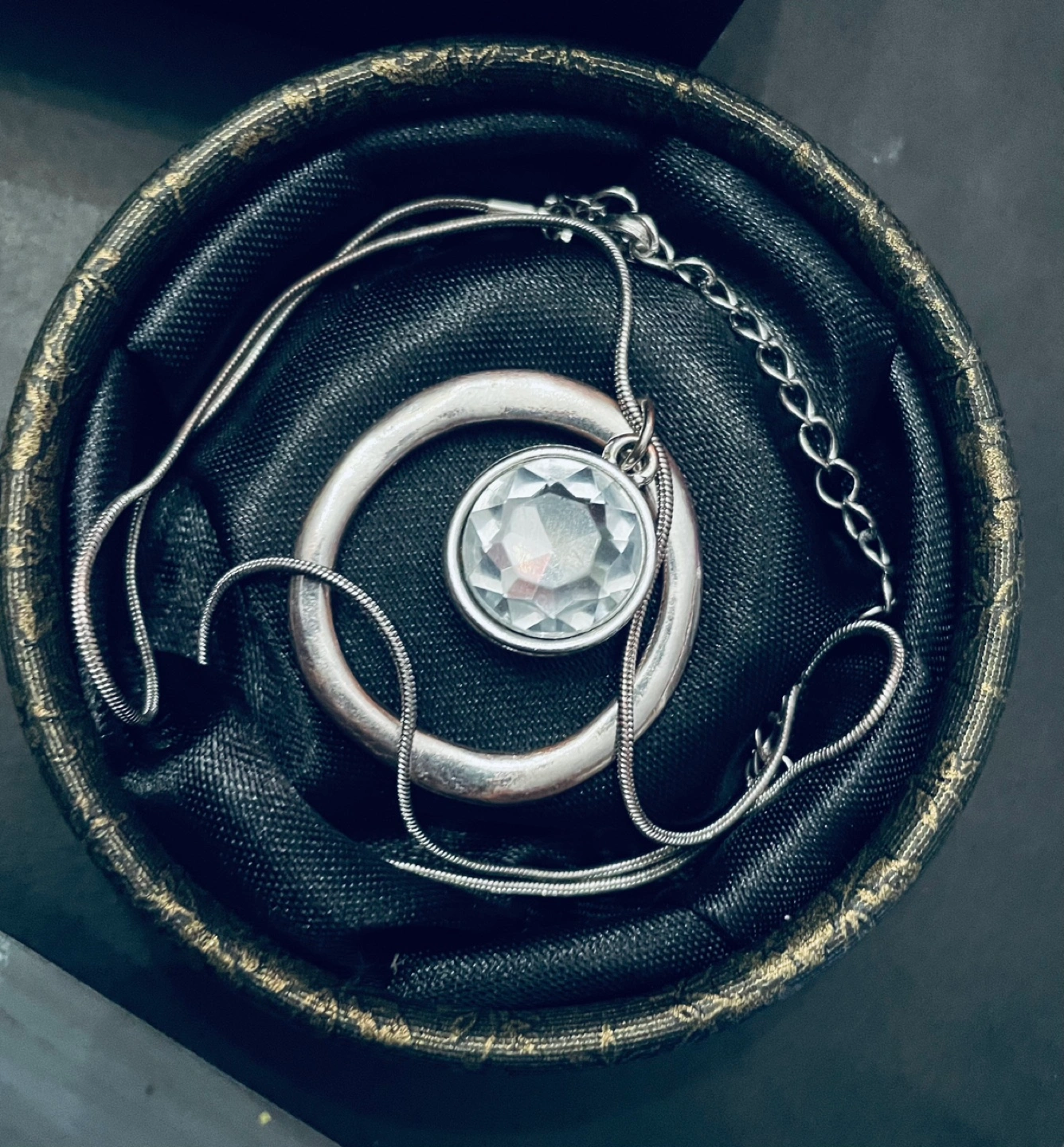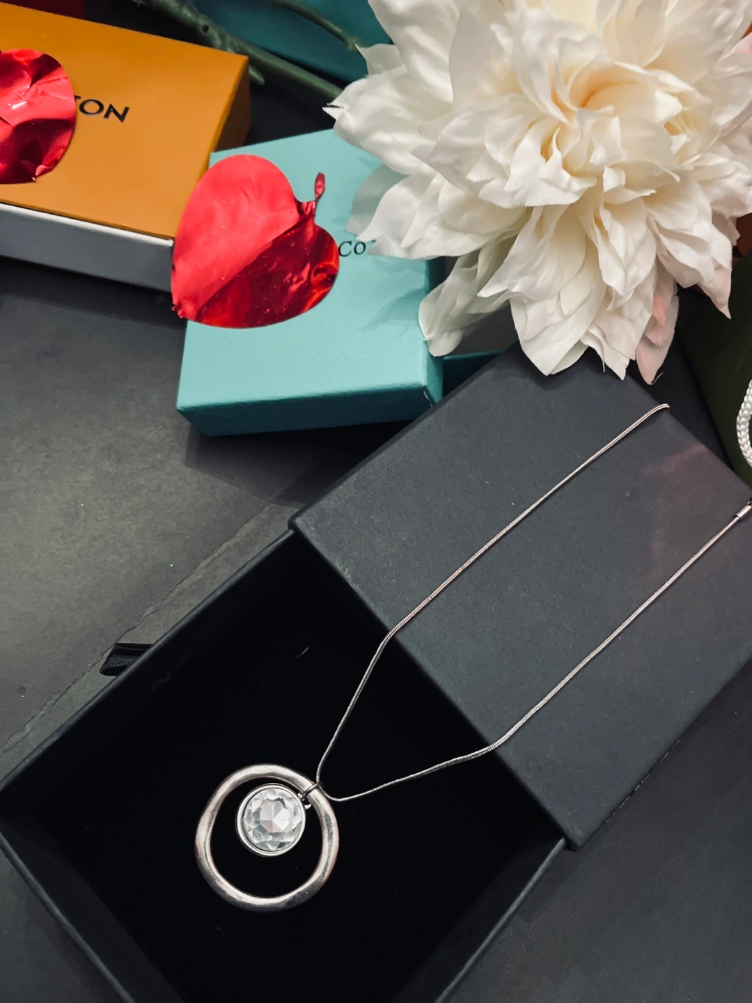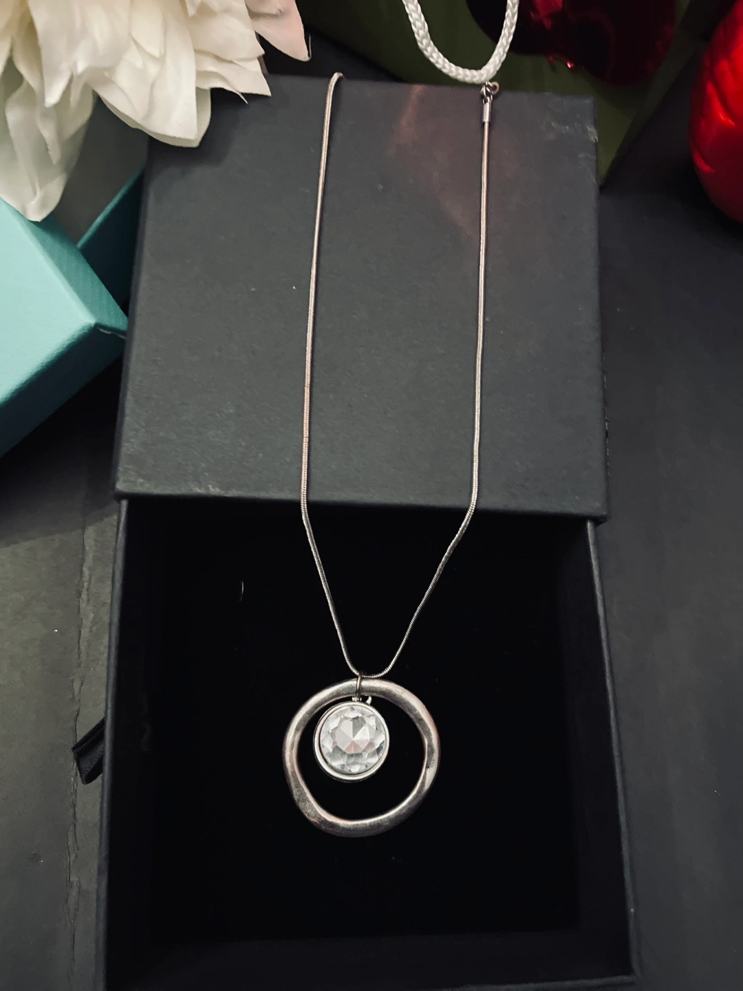 Elegant silver tone necklace. Features a faceted crystal encased in a circular pendant. Delicate chain. Comes in a black gift box. Perfect for layering.