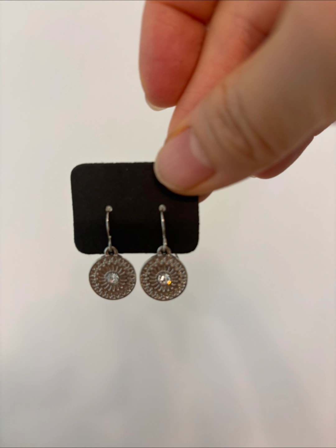 Cute silver tone drop earrings with a floral design. They're in great condition and ready to add a little sparkle to your day!