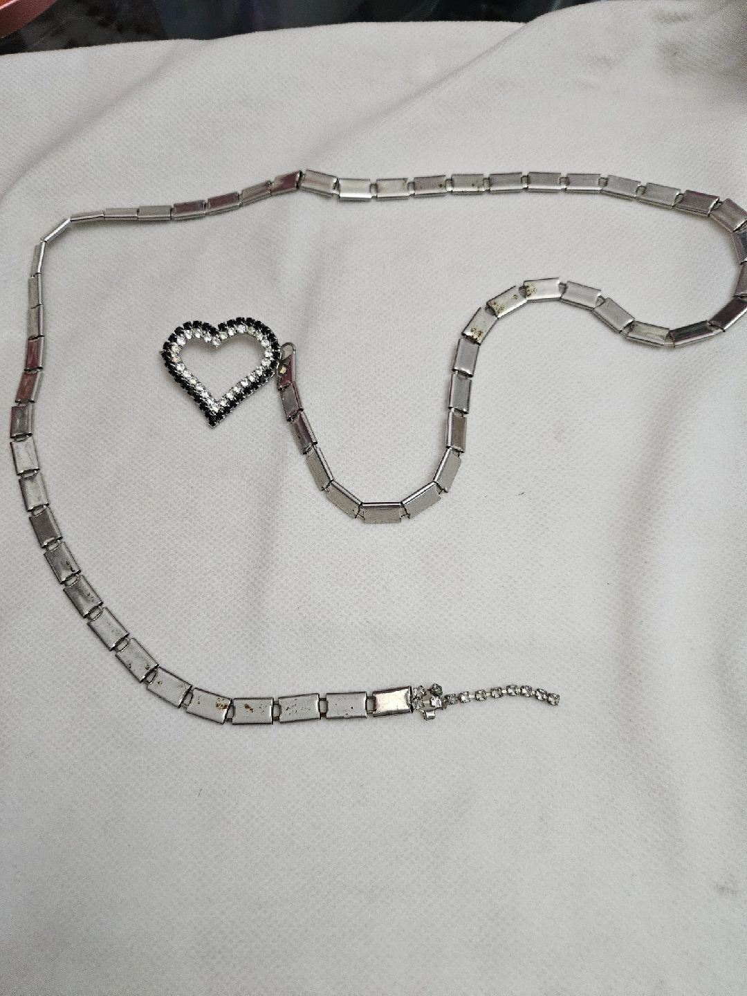 Selling a silver-tone belt featuring a heart-shaped pendant with black and clear stones. It's a stylish piece that would make a lovely addition to any outfit!