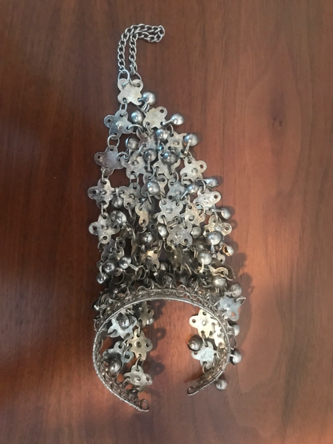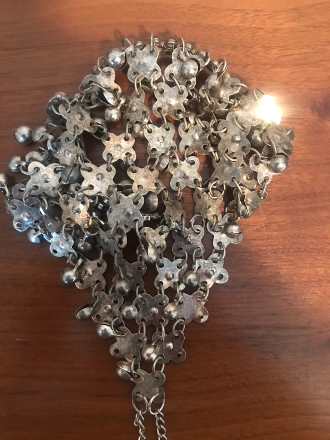 Selling a unique silver-tone metal bracelet. It features a delicate chain and a series of small, decorative elements. It's in great condition!