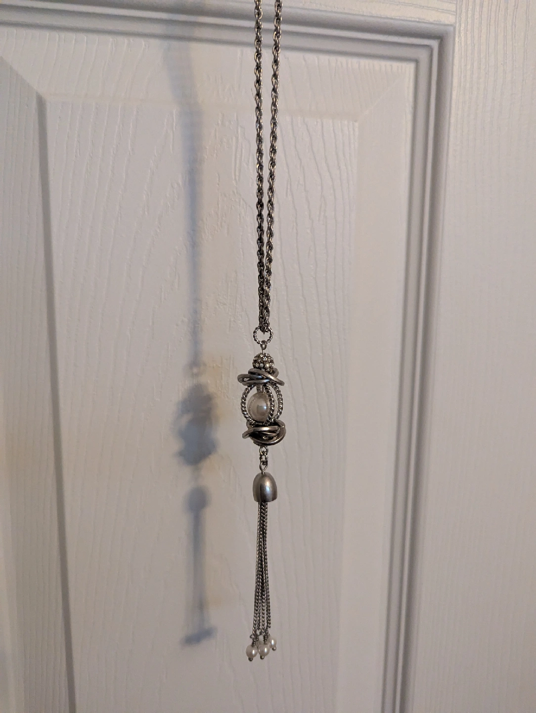 12This is a beautiful silver-toned necklace with a pearl pendant. It has a unique design and would be a great addition to any jewelry collection! 20" in size. SFH