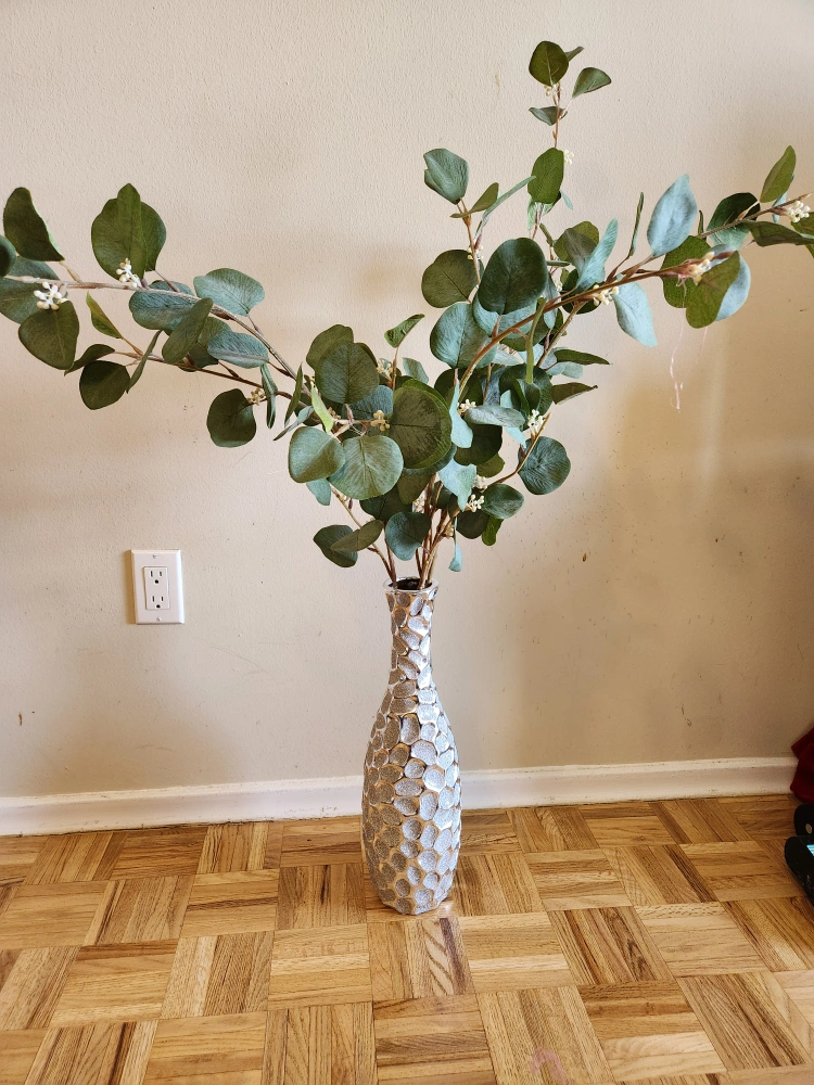 Tall silver vase. Textured surface. Artificial eucalyptus arrangement included. Perfect for home decor. open to offers