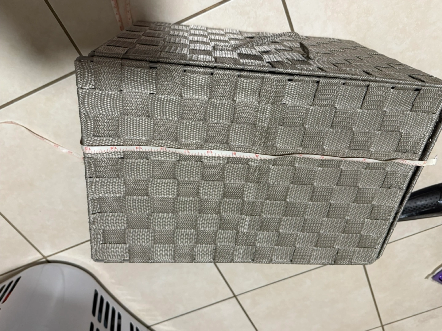 Grey woven storage bin. Features a hinged lid and two small handles. Perfect for organizing various items. Measurements in photo Meet up and cash only Meet at Brentwood mall
