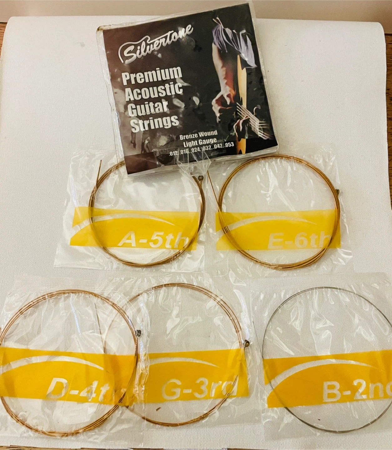 230L Silvertone premium acoustic guitar strings missing one string ( E-1st string)These are bronze wound strings with a light gauge of .012, .016, .024, .032, .042, and .053. Perfect for your acoustic guitar. These are the first of the improved second generation so they're rich and full of tone and super lively on action.