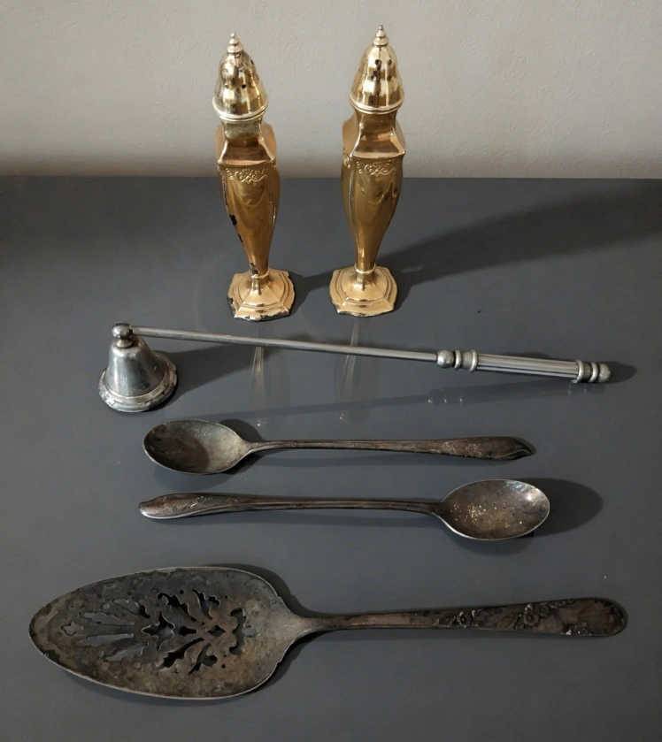 Selling a vintage silver plated serving set! Includes two salt/pepper shakers, two spoons, a cake server, and a candle snuffer. Perfect for adding a touch of elegance to your table. Needs polishing.