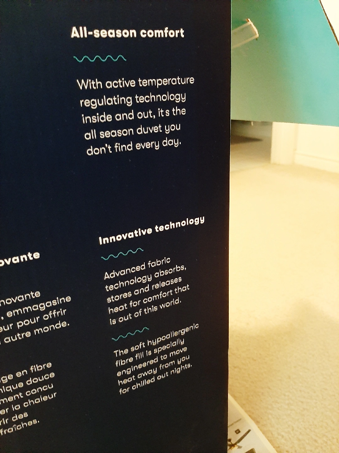 Selling a Simba Duvet, designed for all-season comfort! It features active temperature regulating technology inside and out. The advanced fabric technology absorbs, stores, and releases heat for comfort. The soft hypoallergenic fibre fill is specially engineered to move heat away from you for chilled out nights. Brand new- still in the box!! Price reduced!!
