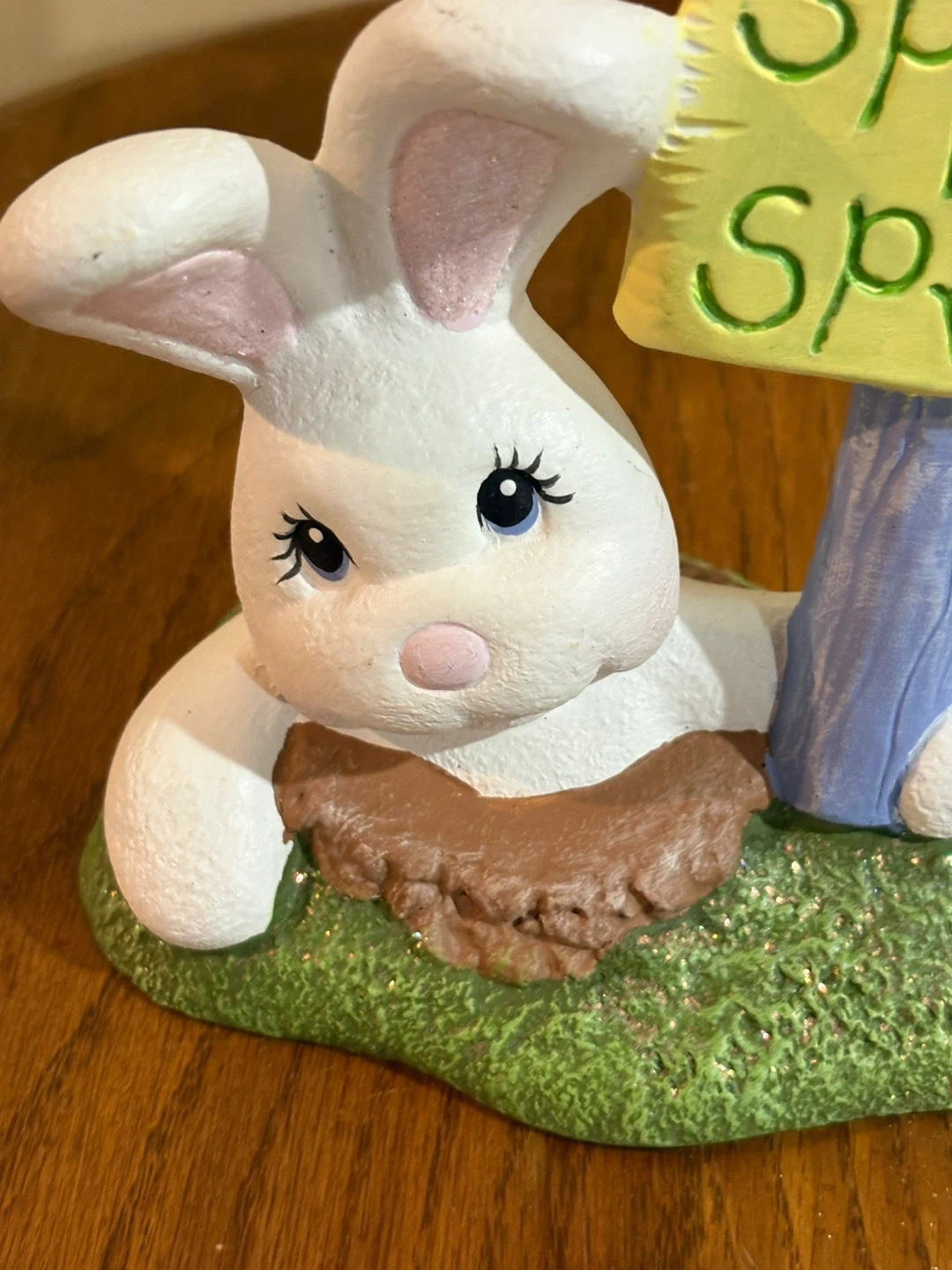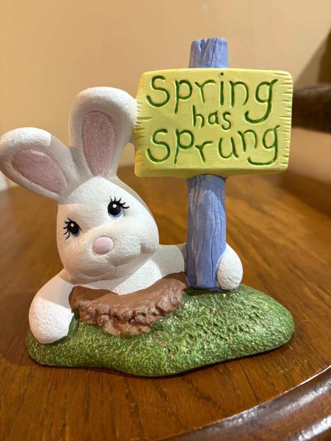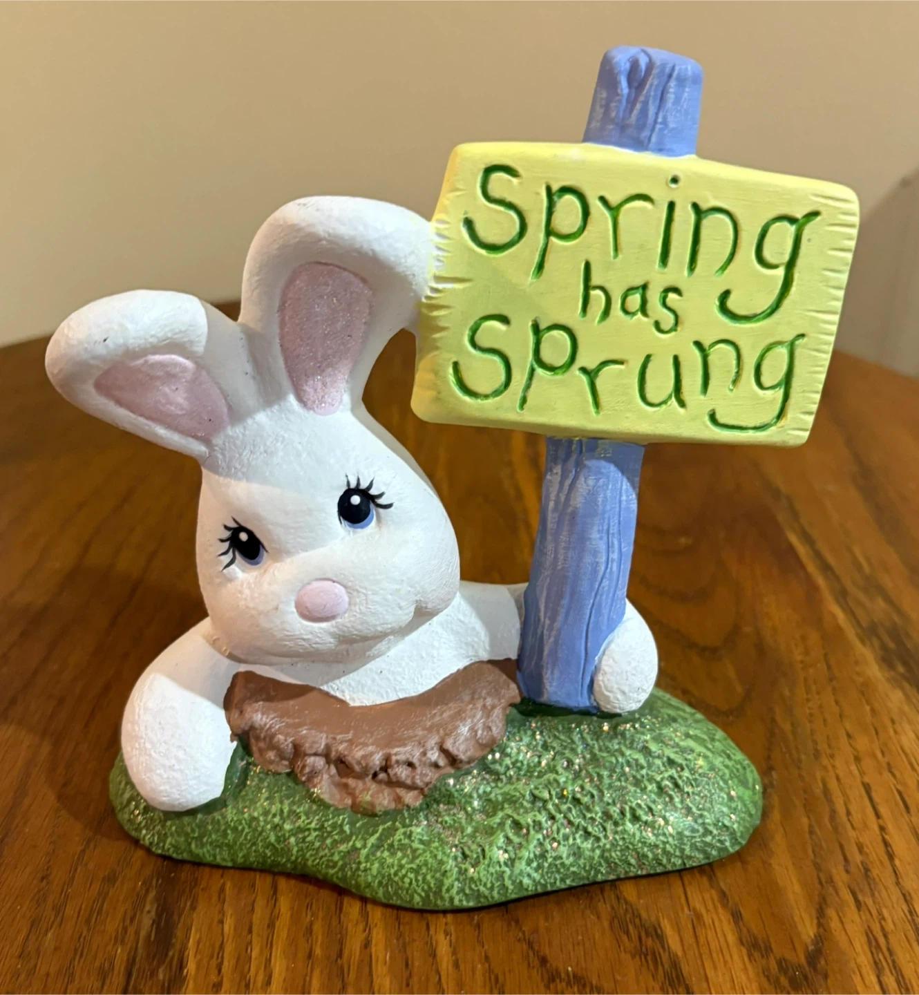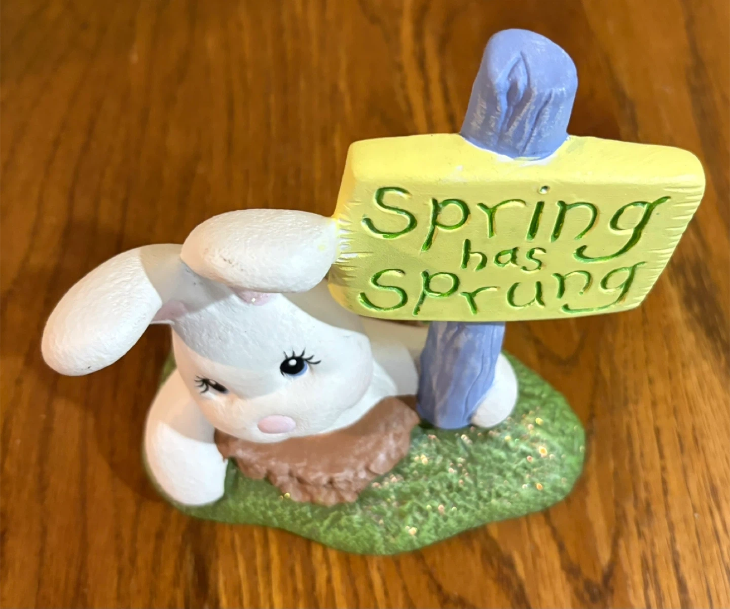 Ceramic Easter Bunny Figurine with "Spring Has Sprung" Sign