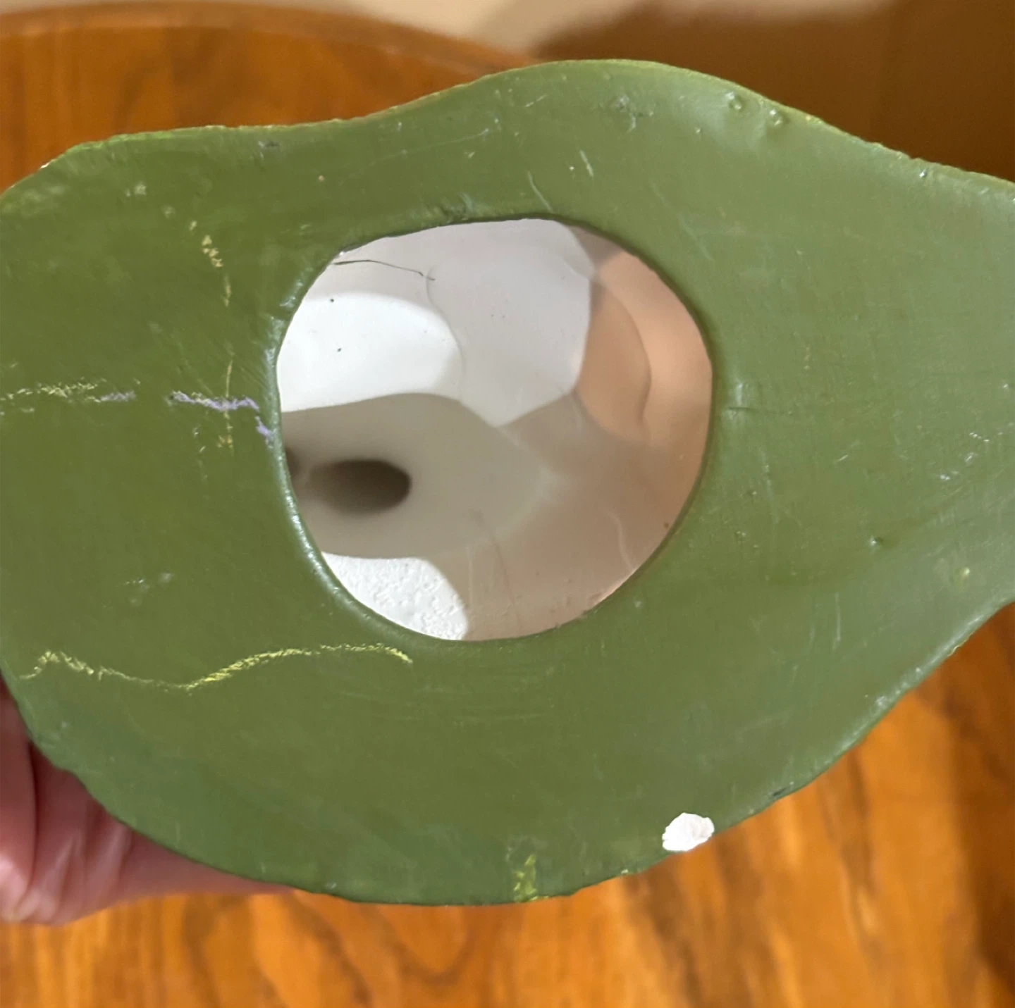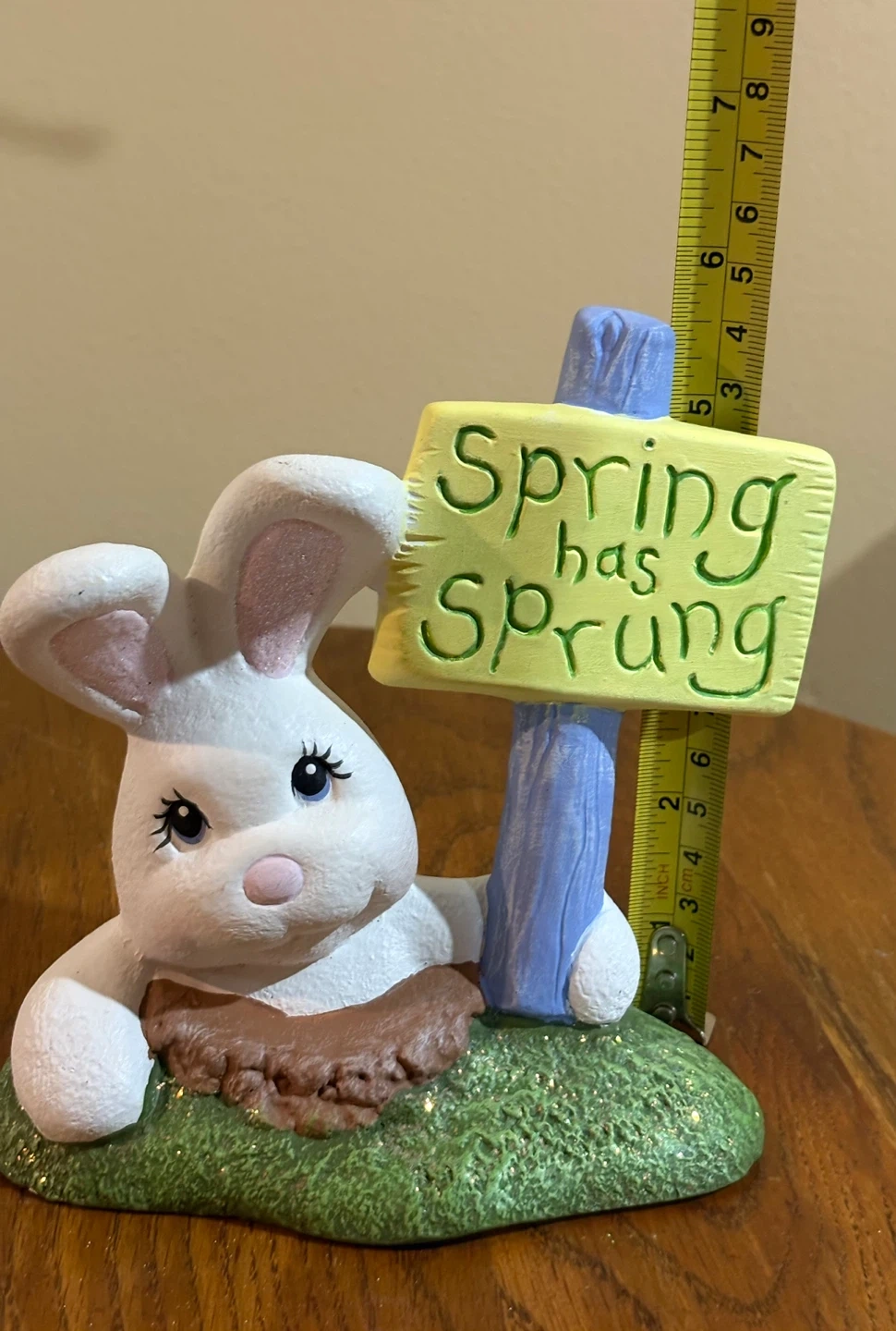 Cute ceramic Easter bunny figurine. It features a white bunny peeking out from the ground, holding a yellow sign that reads "Spring Has Sprung." It's a festive decoration for the spring season! Made of ceramic.
