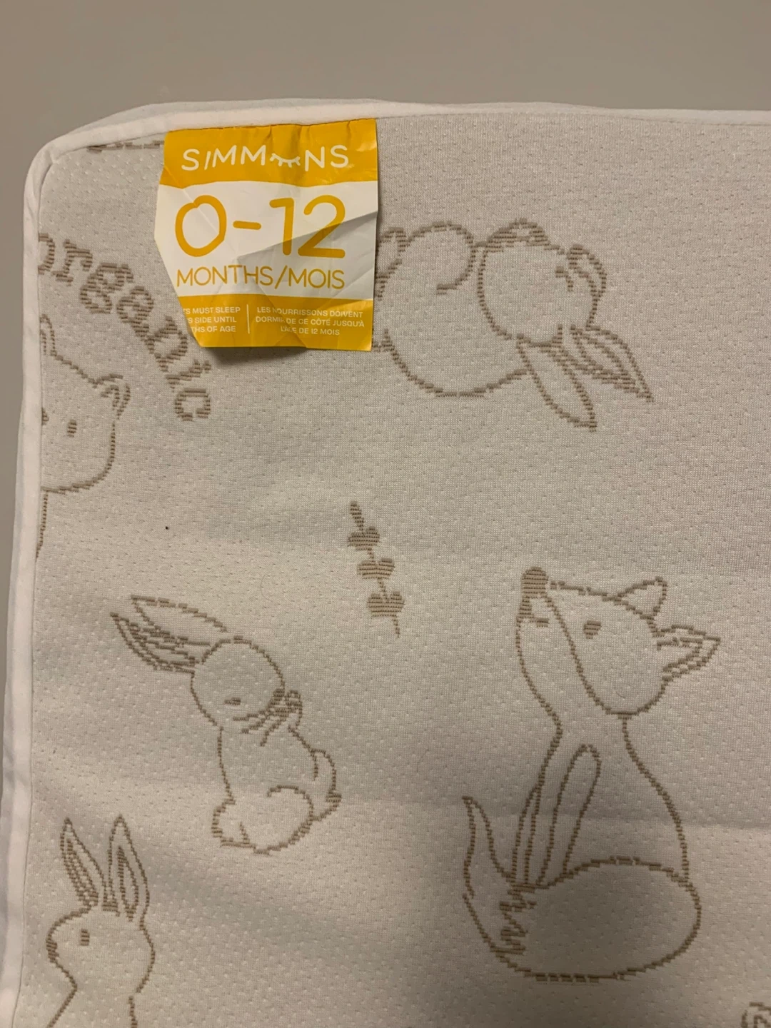 Selling a Simmons Kids organic crib mattress. It's designed for babies aged 0-12 months and features a cute animal print! Perfect for a cozy and safe sleep environment for your little one