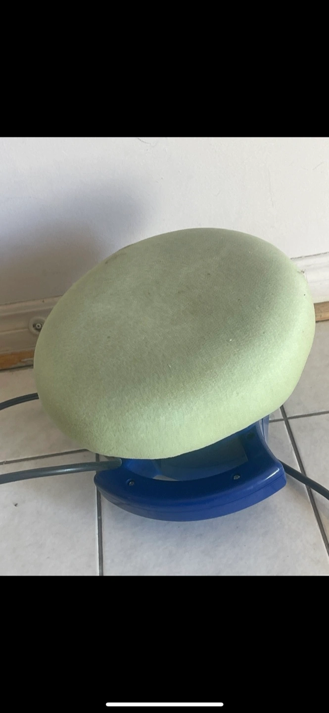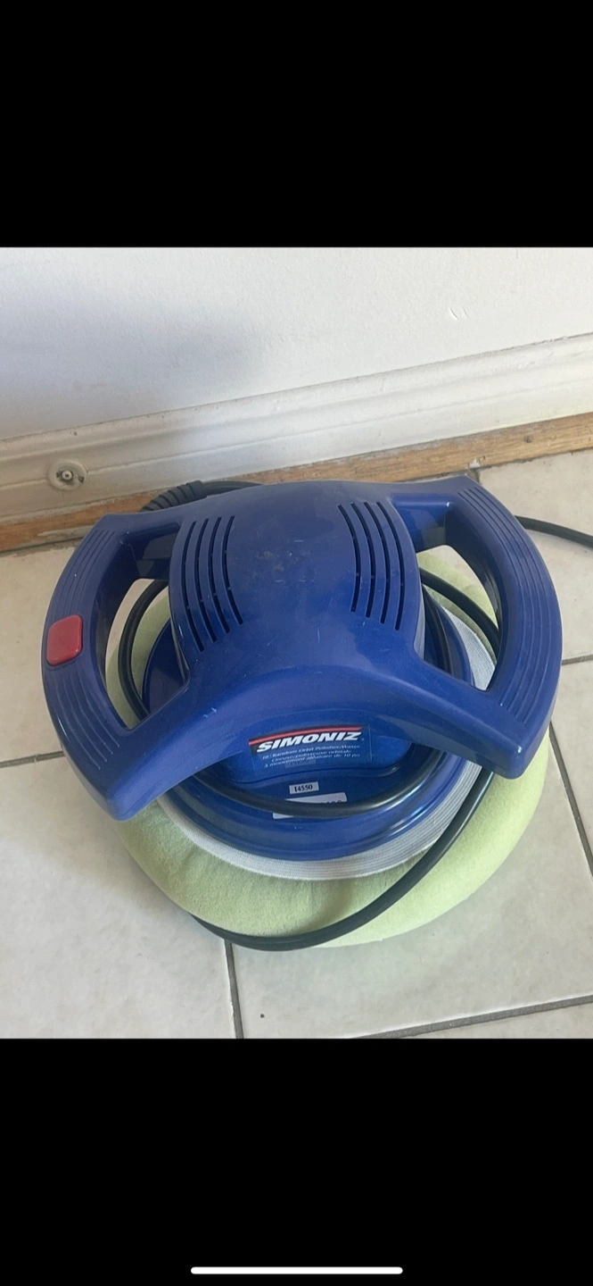 Here is a polisher. It features a blue body. The polisher has a green foam pad attached. Polishing your vehicle is a great way to unwind after a long day.