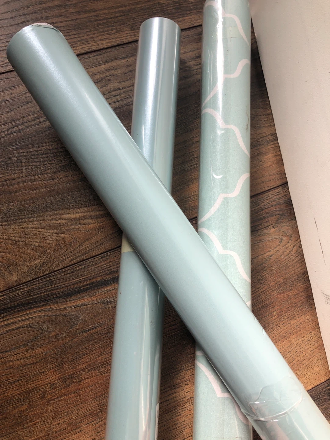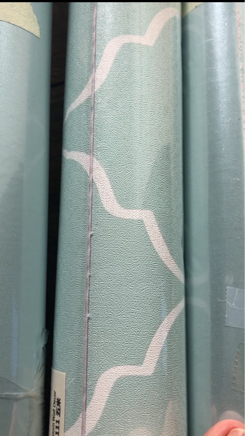 Perfect for small projects. Various rolls of wallpaper. Designs include abstract waves, roses and leaves, marble patterns, and a scenic print. Some rolls are solid light blue or teal.