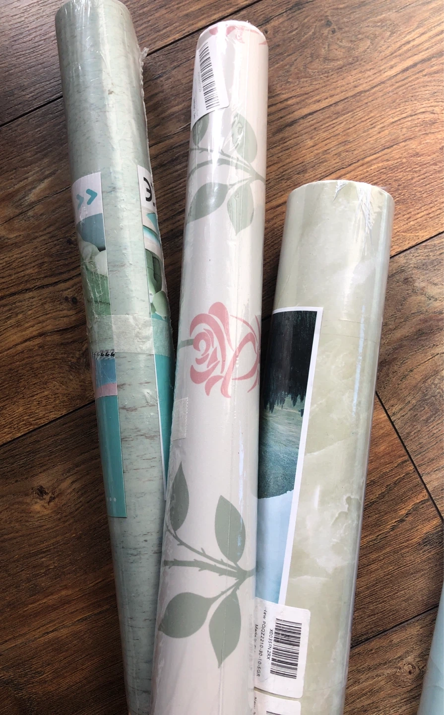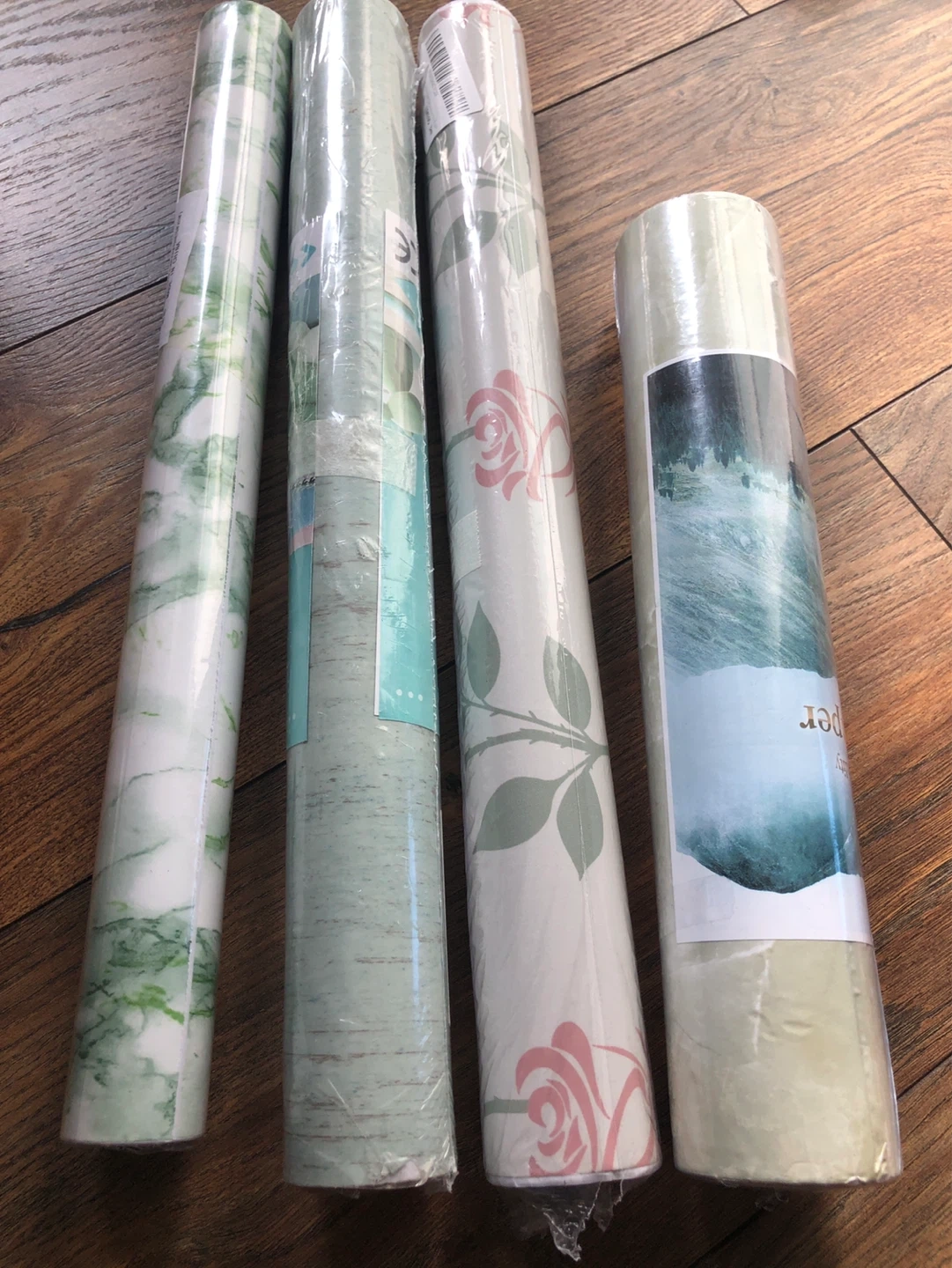 Perfect for small projects. Various rolls of wallpaper. Designs include abstract waves, roses and leaves, marble patterns, and a scenic print. Some rolls are solid light blue or teal.