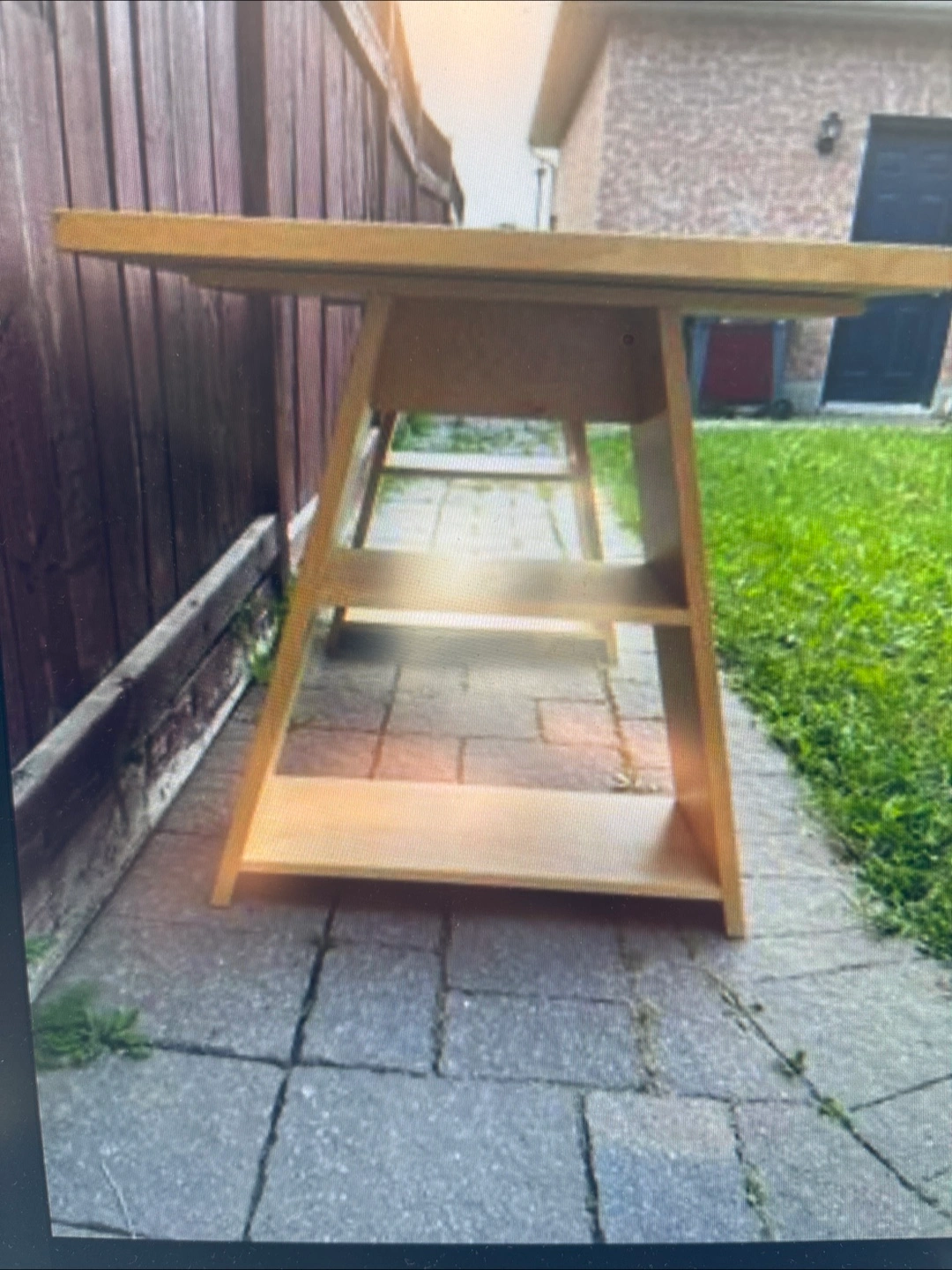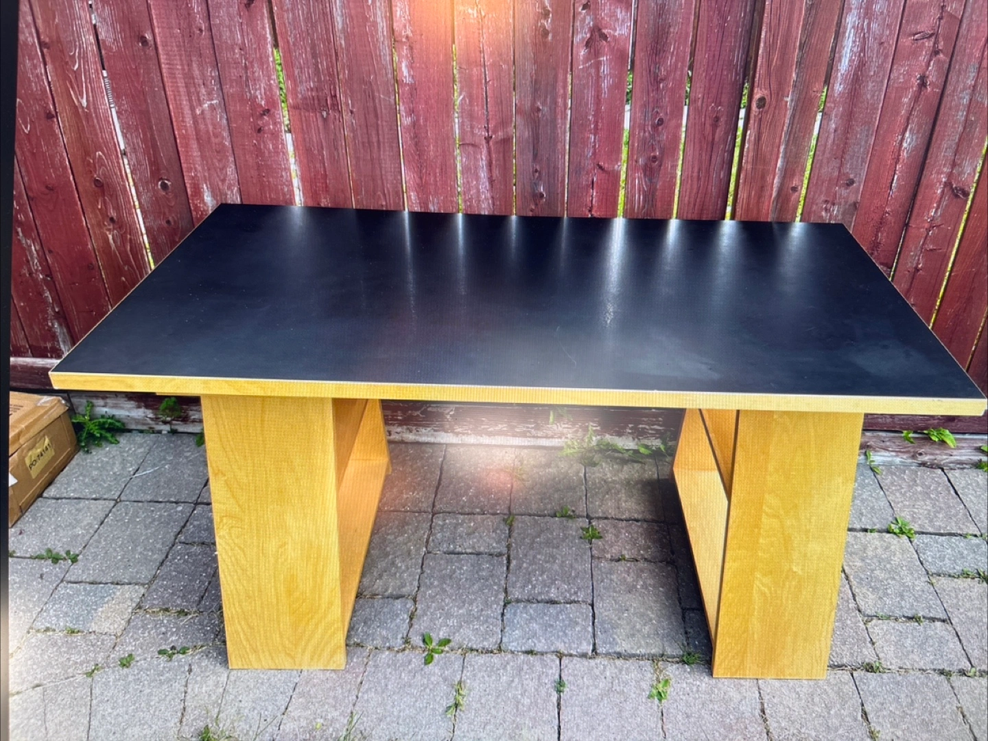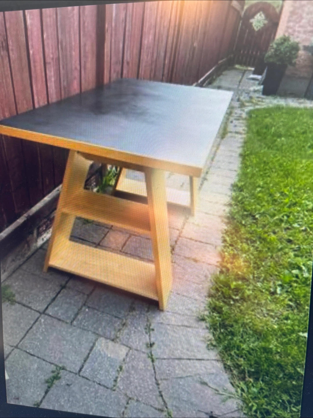 22Black and oak coloured study table can be used for work or craft with kids. Black laminate top. Two shelves for storage. Good for any space, bedroom, basement or office. This is from ikea but discontinued. I used a table cover so it’s almost brand new. Pick up only.