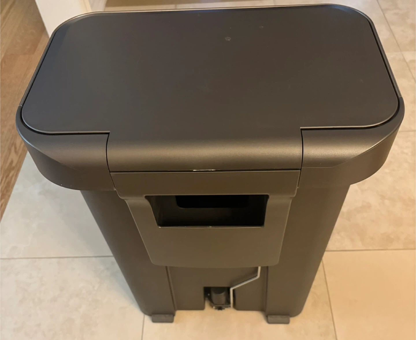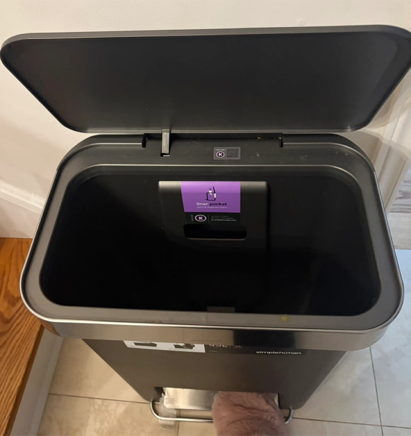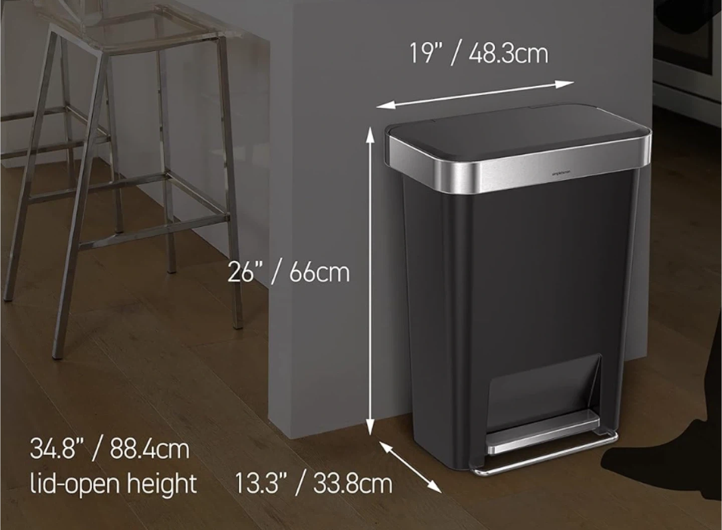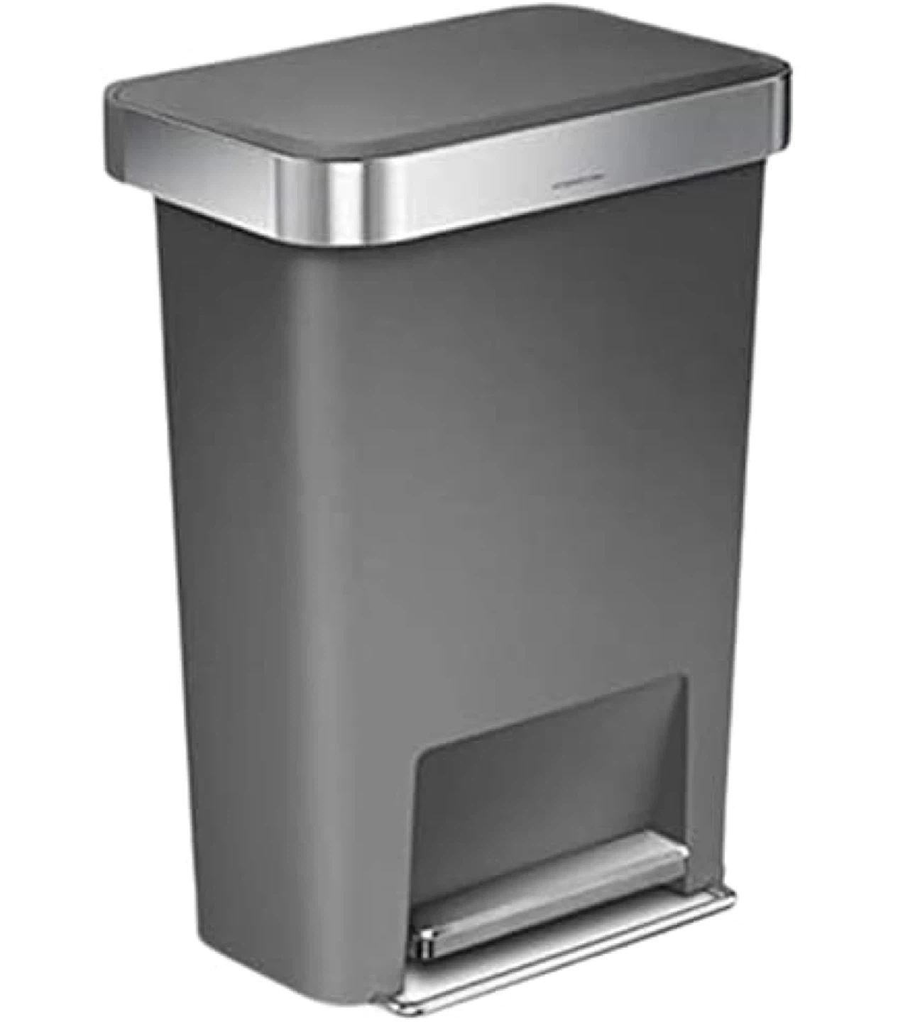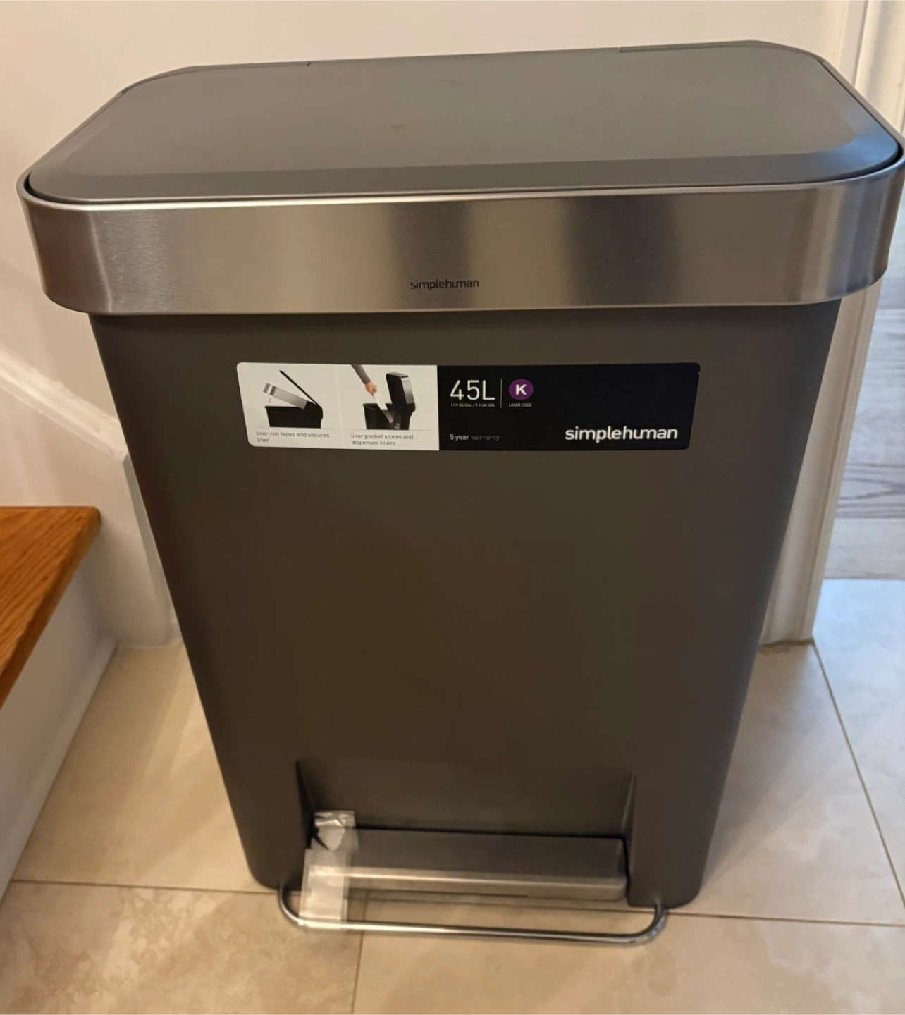 5Simplehuman 45L Rectangular Step Can with a liner pocket. Bought it 4 months ago and didn’t use it. * Capacity: 45 liters (12 gallons) * Features: A strong steel pedal, a liner rim that hides the trash bag, and a liner pocket that stores and dispenses simplehuman Code K liners from inside the can. * Dimensions: see picture * Material: plastic and stainless steel finishes