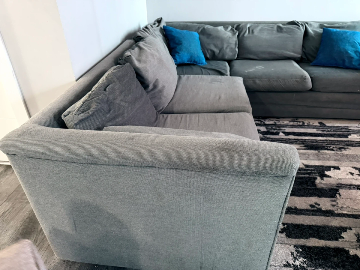 This is a comfortable grey sectional sofa. It comes with two blue accent pillows. The fabric has a corduroy-like texture.has a normal wear and tear. Delivery available at a charge.