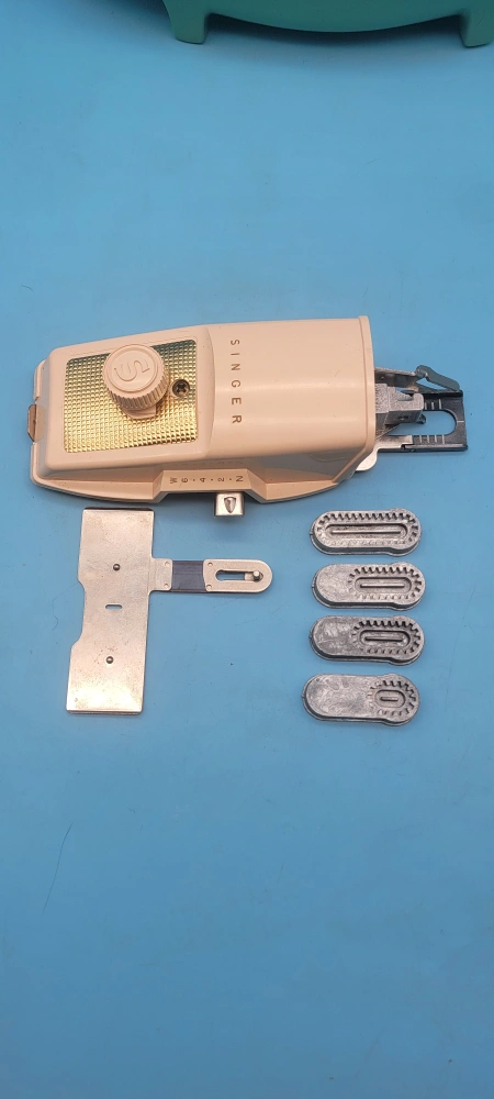 Selling a set of vintage Singer sewing machine Buttonholer Attachments! In good condition and comes with the Buttonholer, templates, attachments and original case. Perfect for someone who loves vintage sewing machines or needs replacement parts. Please look closely at the attached photos to go along with the description and the condition of the item. Willing to ship at the Buyers expense. Please see my many other listings. Thank you for looking. Have a Happy Day! 🙂