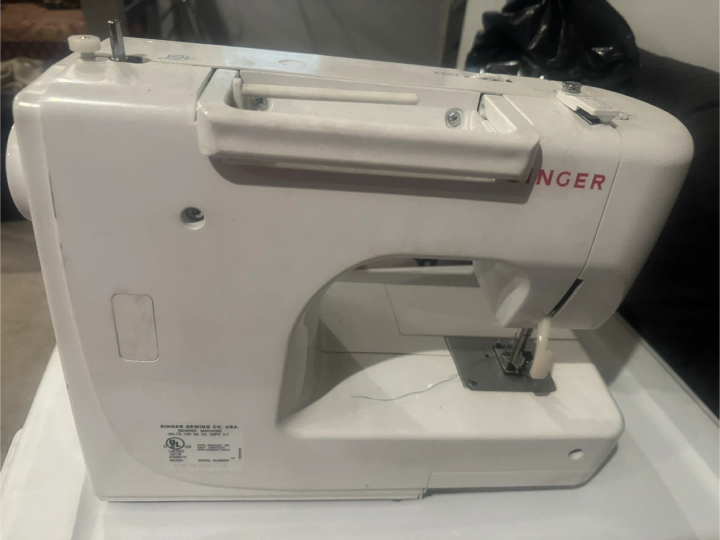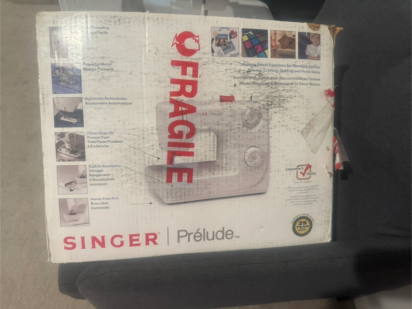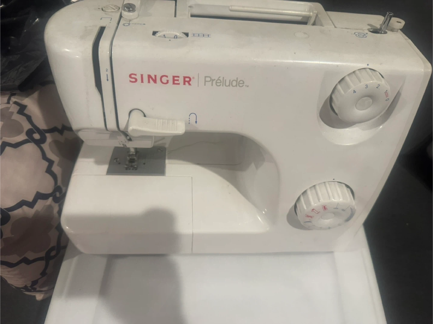 Selling a Singer Prelude sewing machine. It has multiple stitch functions for mending, sewing, drafting, and home decor. It also features automatic buttonholes, three snap-on presser feet, and built-in accessory storage. The box is included!