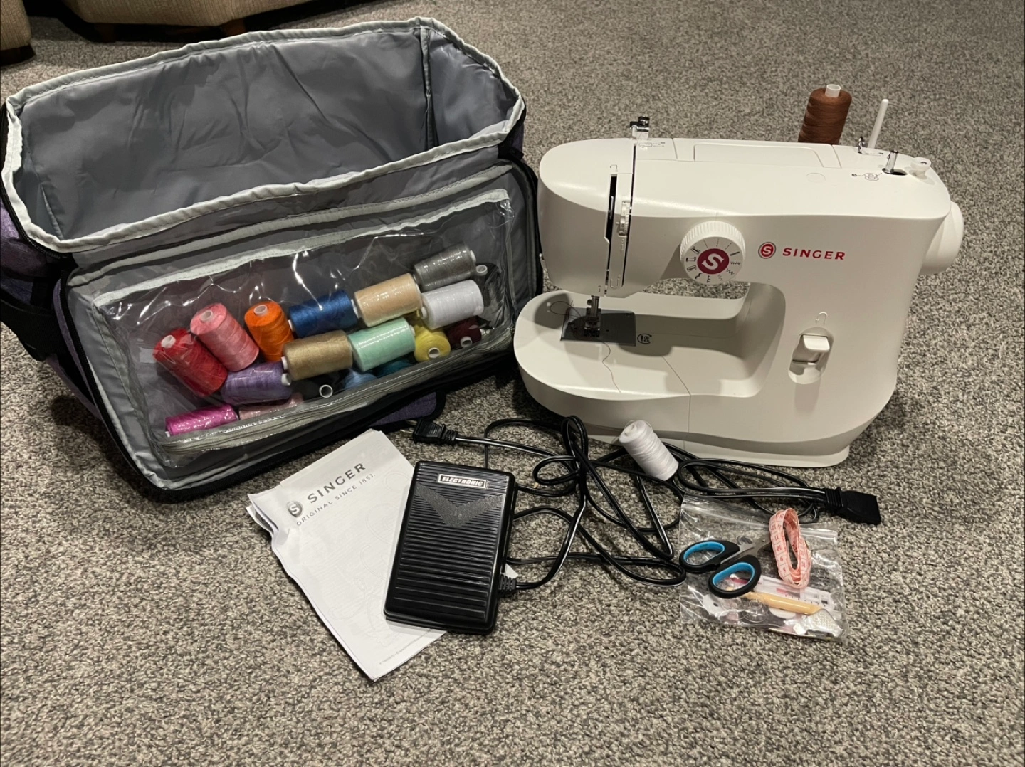 Selling a Singer sewing machine that's in great condition! It comes with a convenient carrying case, foot pedal, and various coloured threads. Perfect for your sewing projects!