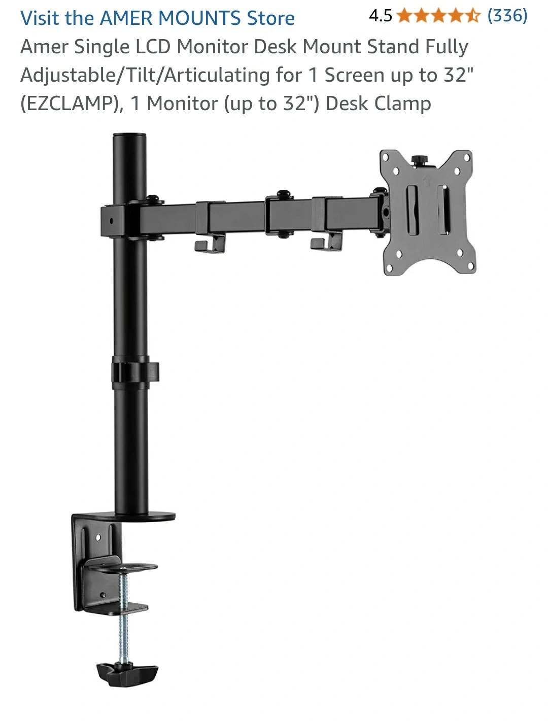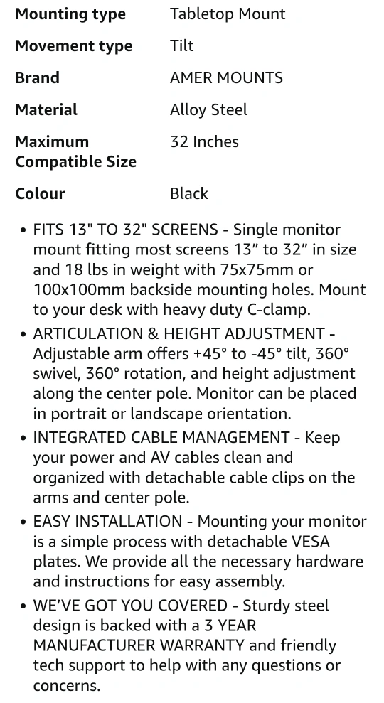 Fully adjustable monitor desk mount. Fits screens 13" to 32". Tilts and articulates. Heavy-duty C-clamp. Includes all necessary hardware. 3-year manufacturer warranty.