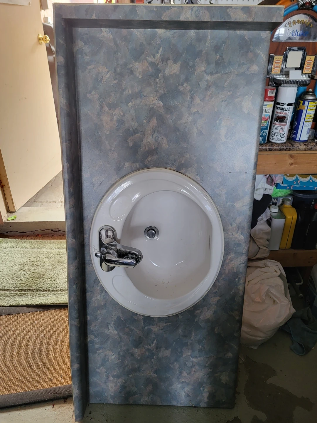 20Selling sink with top It's a unique piece that could add character to your space. The sink is white, and the cabinet has a blue and grey marbled pattern. Ready for a new home!