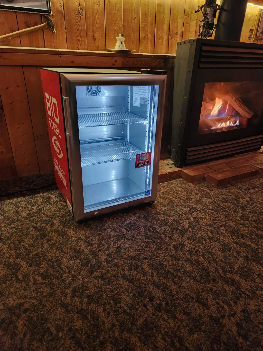 This is a Bio Steel mini fridge. It's a compact cooler with three shelves. Includes interior lighting and a glass door.
